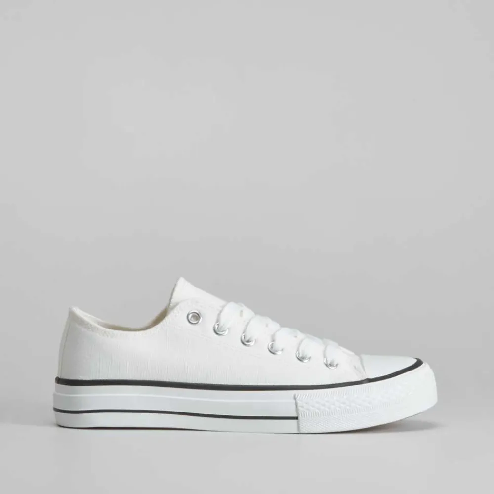 Zapatilla de lona básica de la marca NYC para mujer. Exterior textil liso y sencillo en color blanco. Cierre de cordones y puntera de caucho.