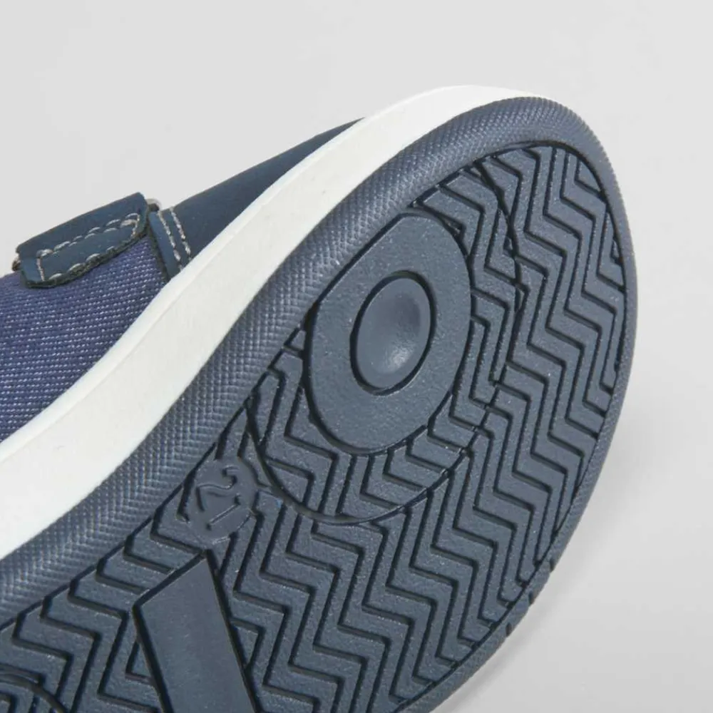 Zapatilla deportiva con velcros de BACHE para bebé. Modelo en color azul efecto denim con dos tiras de velcro y banda lateral.