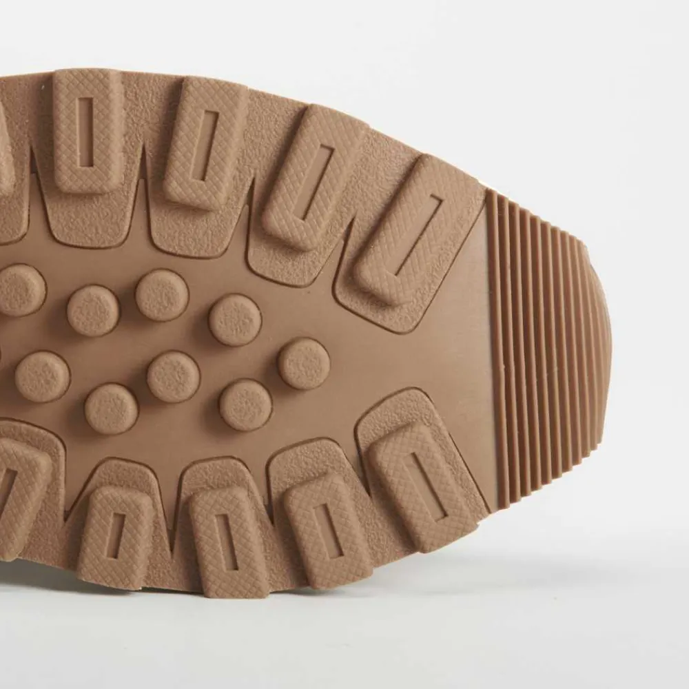Zapatilla urbana para mujer de la marca NYC. Modelo con paneles combinados en color beige y gris, cierre de cordones y suela dentada bicolor.