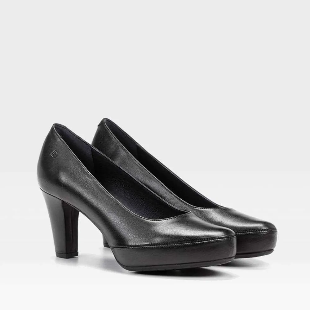 Zapato de salón negro de la marca FLUCHOS para mujer. Corte confeccionado en piel con un diseño cómodo y flexible. Tacón 6cm de altura. Hecho en España.