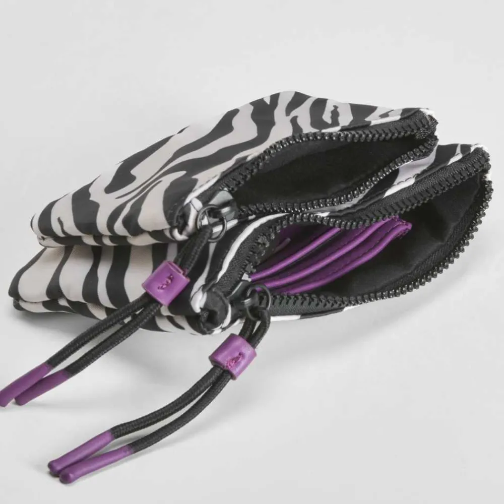 Monedero de nylon de NYC para mujer con print de cebra blanco y negro. Tiene dos bolsillos con cremallera y ranura para tarjetas en el interior.