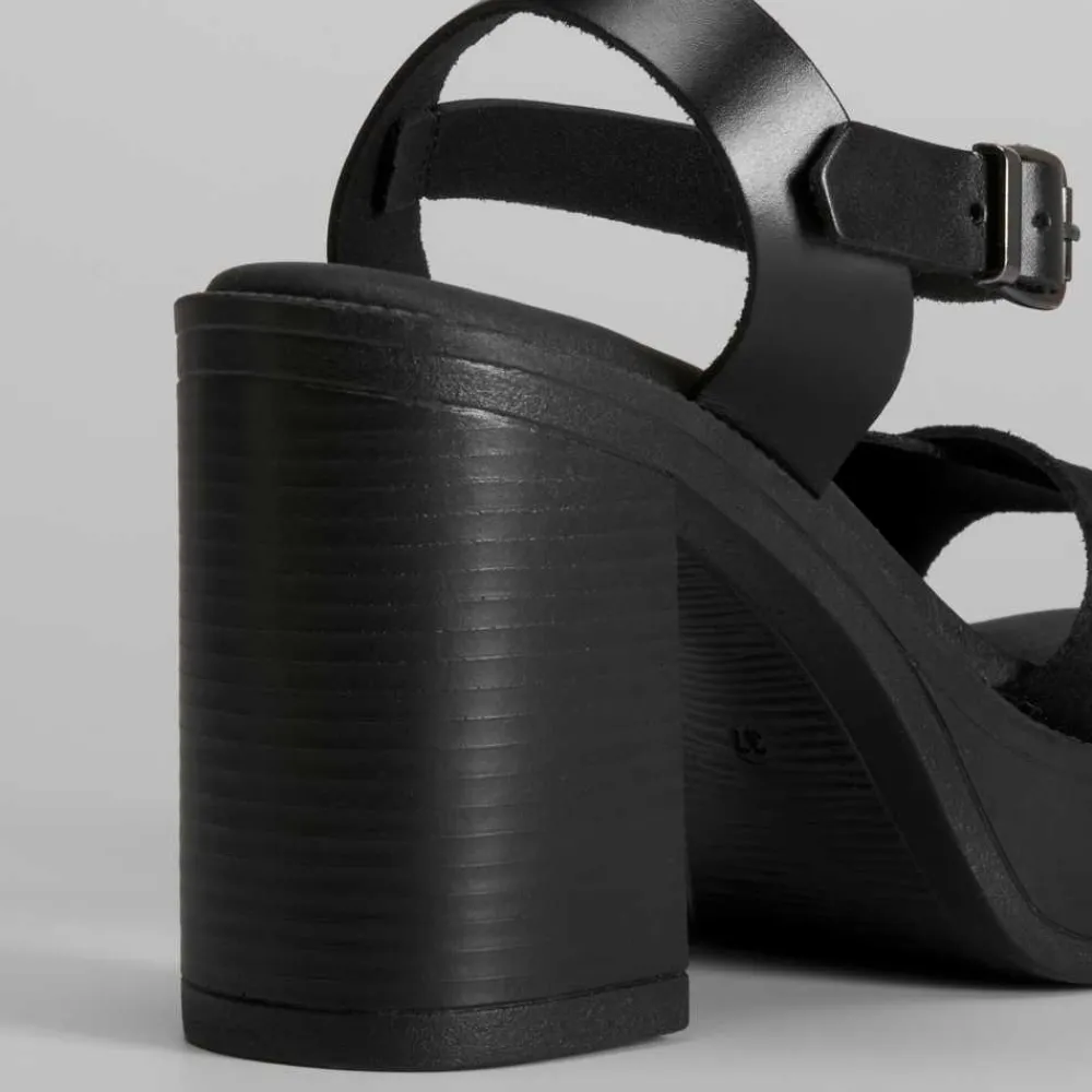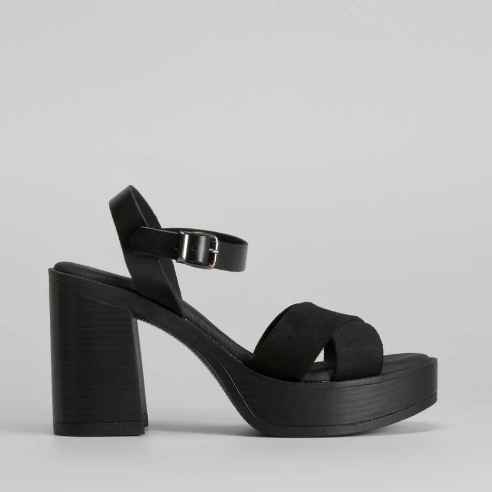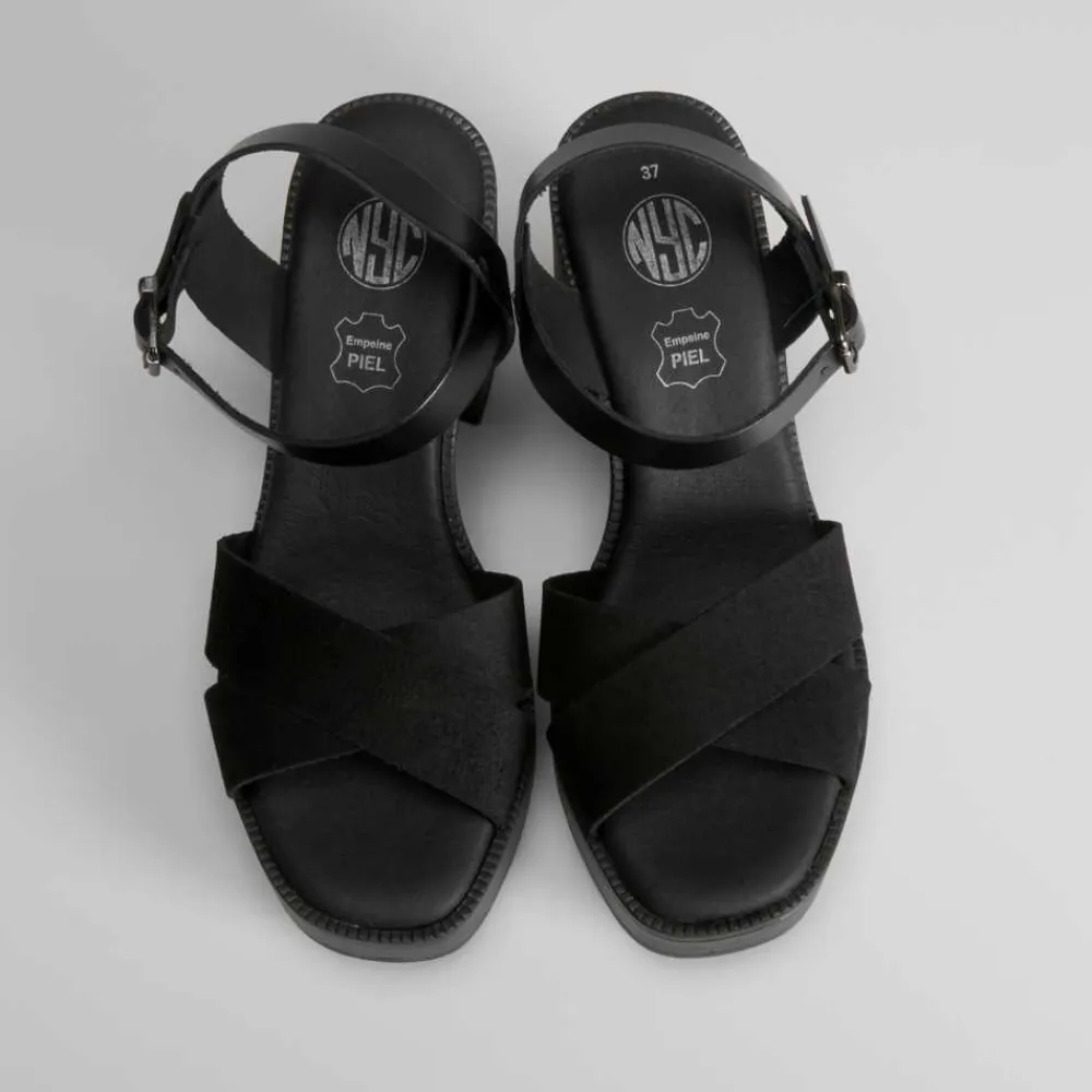 Sandalia de tacón alto con la pala cruzada de la marca NYC. Corte de piel en color negro con cierre de hebilla y plantilla acolchada. Tacón de 9cm de altura. Hecho en España.