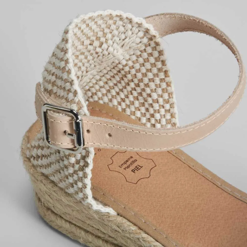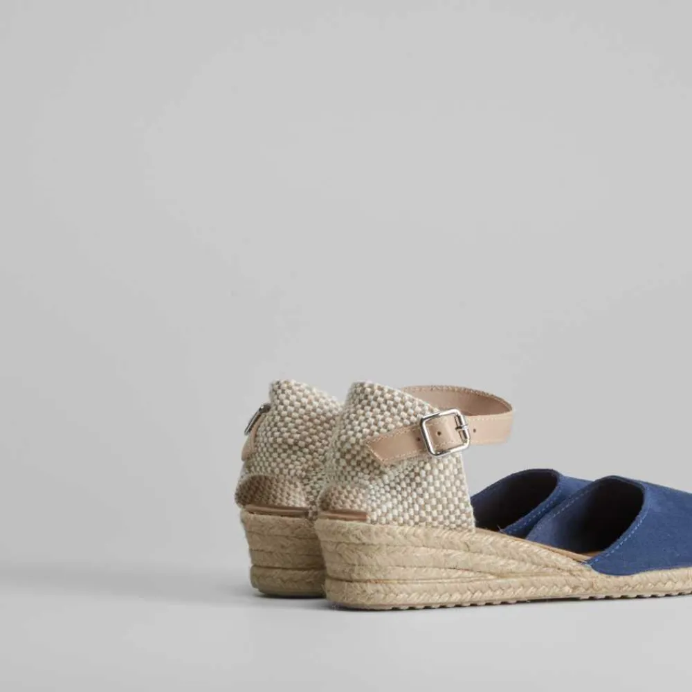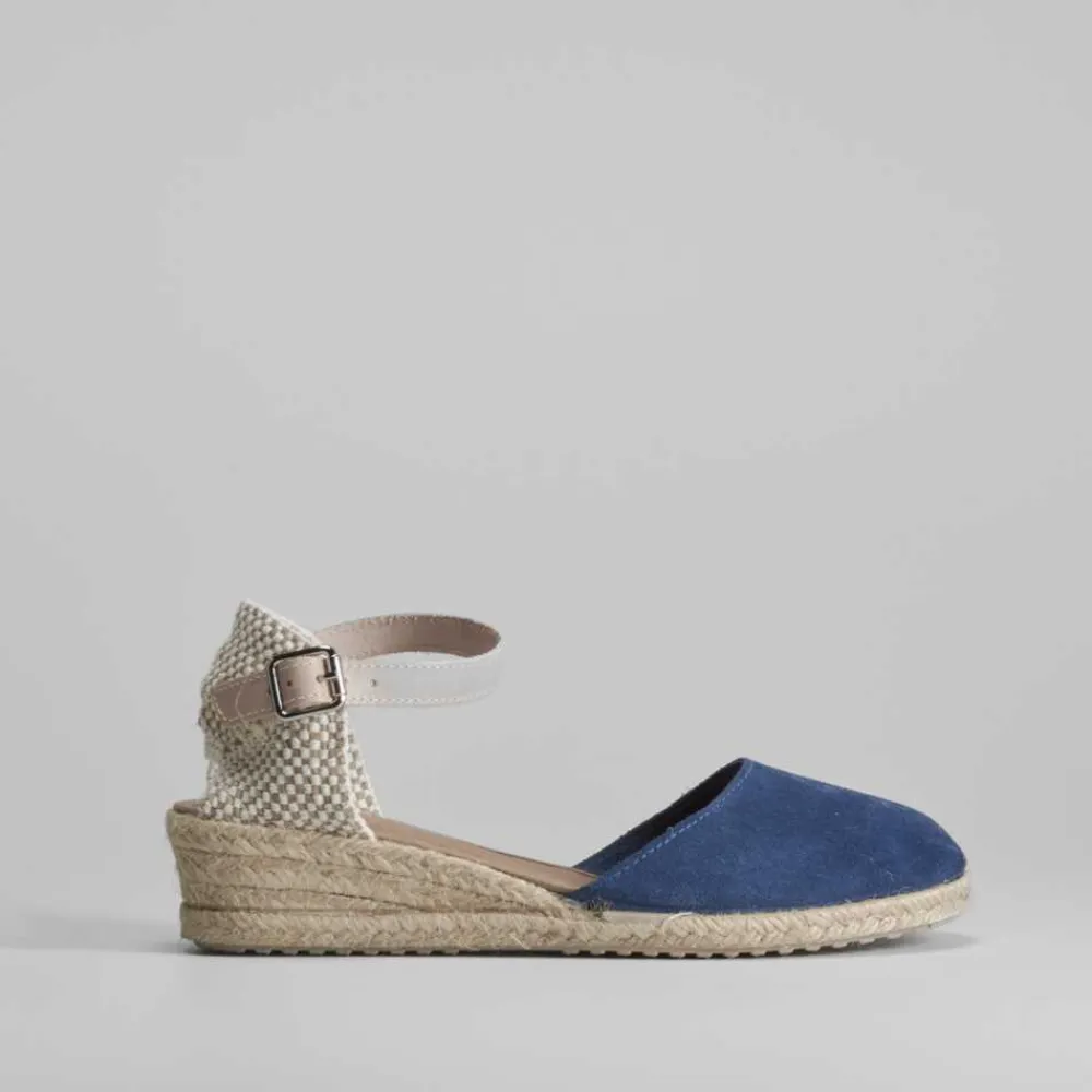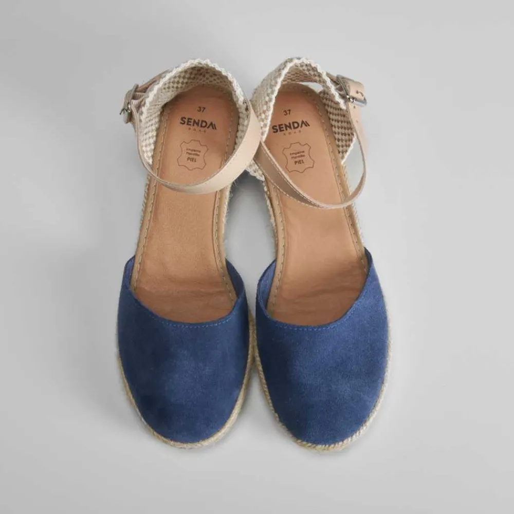 Sandalia de piel para mujer de la marca SENDA ROAD. Modelo en color azul, cierre de hebilla trasero ajustable y suela de yute con cuña de 4cm. Hecho en España.
