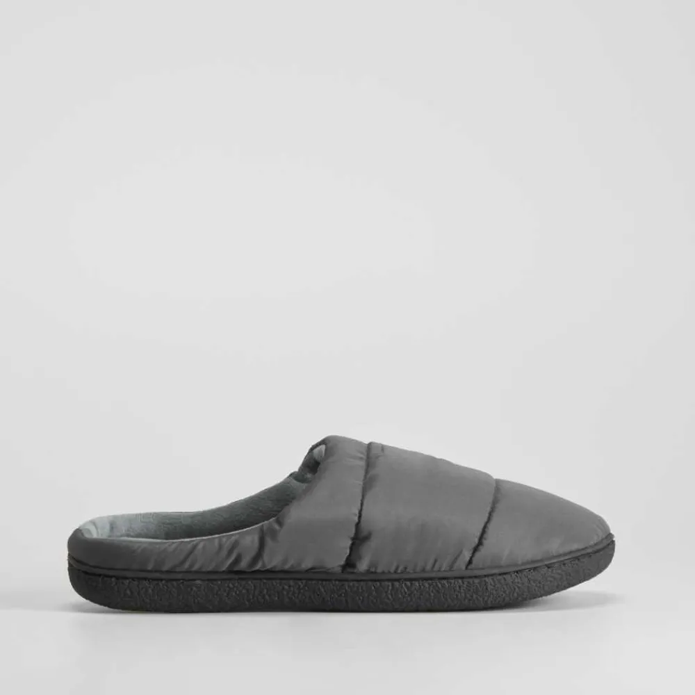 Zapatilla de andar por casa acolchada en nylon de la marca ACHUCHONAS. Modelo en color gris, interior forrado muy cálido y plantilla de gel muy confortable.