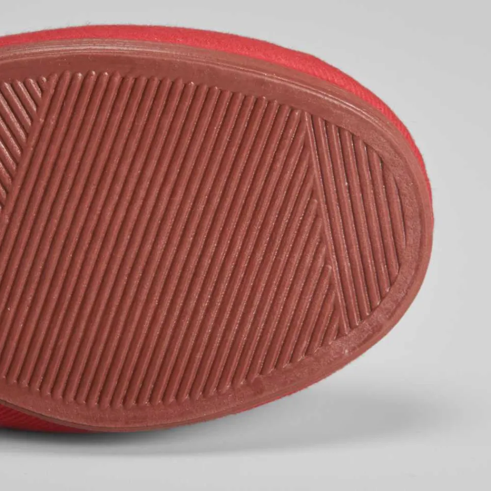 Zapatilla kunfu de la marca SEVEN FIVE. Modelo en color rojo con dos elásticos y suela ligera de goma. Hecho en España.