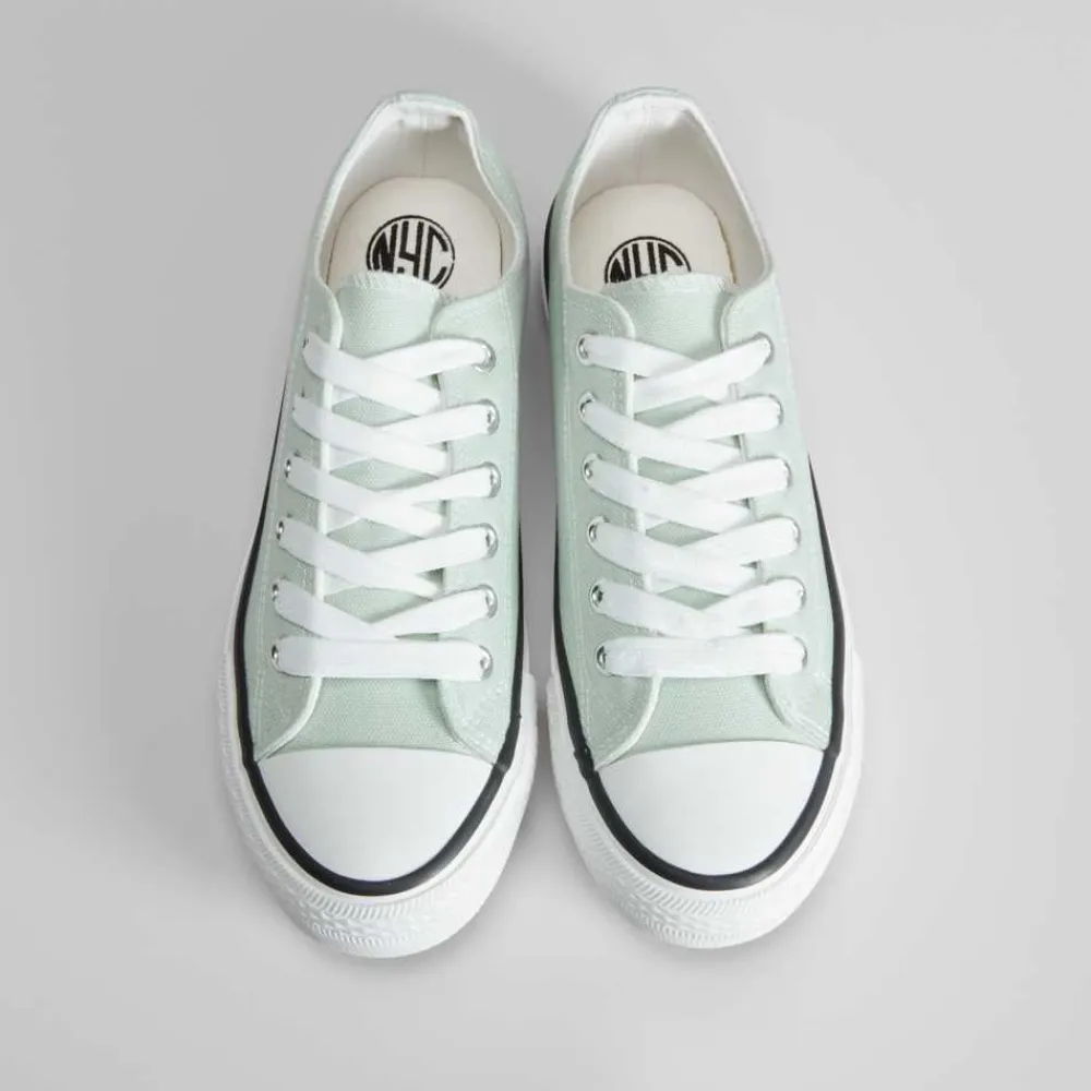 Zapatilla de lona básica de la marca NYC para mujer. Exterior textil liso y sencillo en color verde menta. Cierre de cordones y puntera de caucho. .