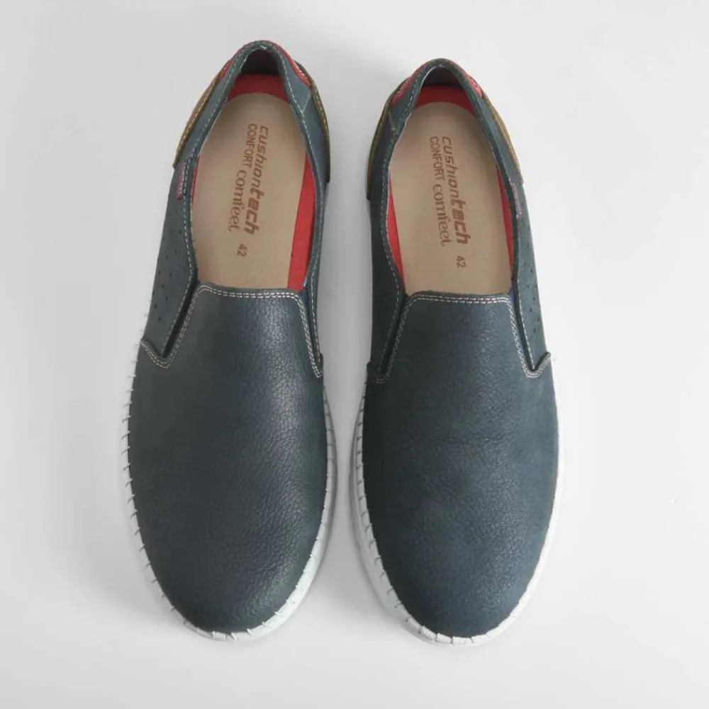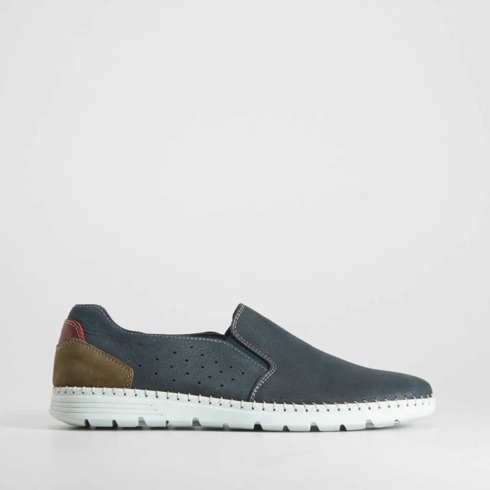 Zapato casual slip on de ancho especial de la marca COMFEET. Corte de piel en color cuero con elásticos en el empeine y perforados laterales. Hecho en España.