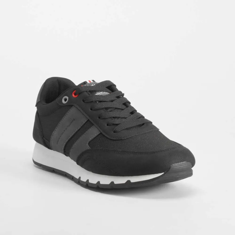 Zapatilla de color negro con detalles en gris y suela blanca que aporta contraste y estilo casual. El diseño incorpora franjas laterales y ojales decorativos rojos para un toque moderno y versátil. Ideal para el día a día, este modelo pertenece a la marca NYC.