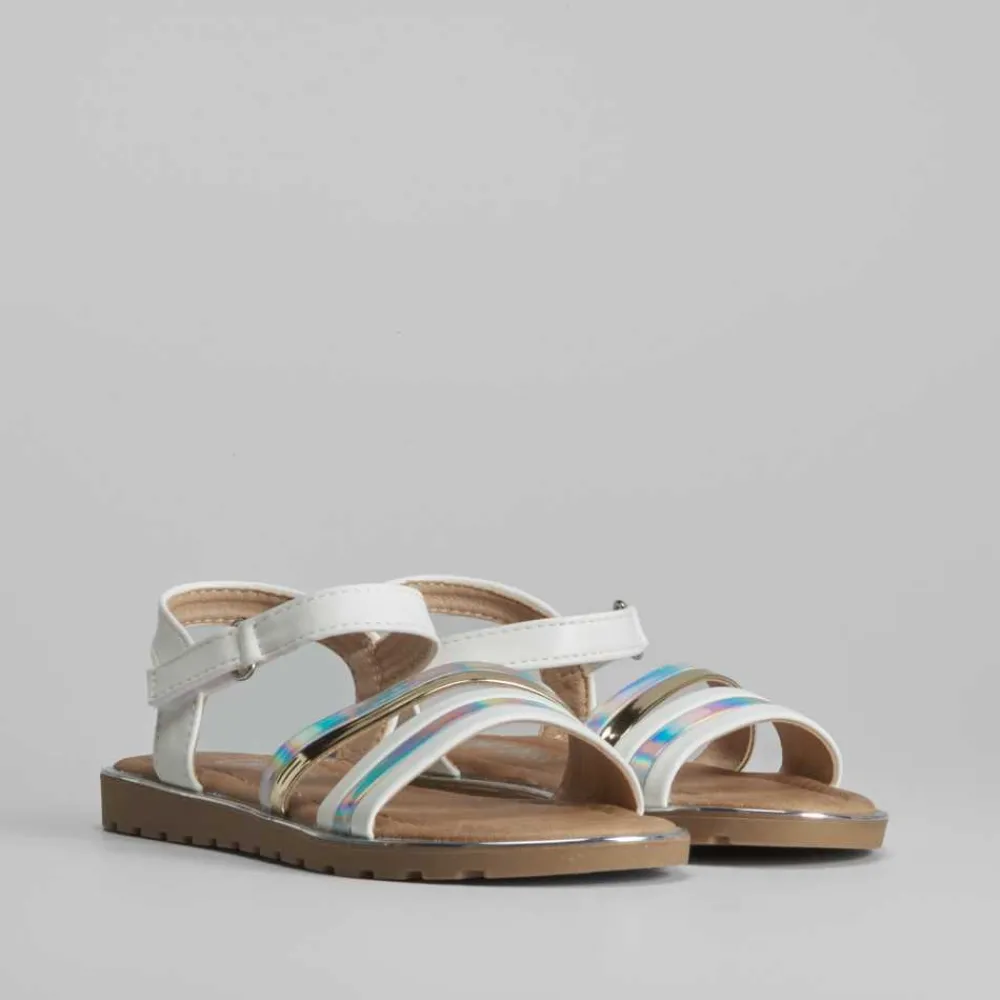 Sandalia blanca infantil de la marca OH GIRL. Pala combinada con tiras metalizadas e iridiscentes. Cierre de velcro.