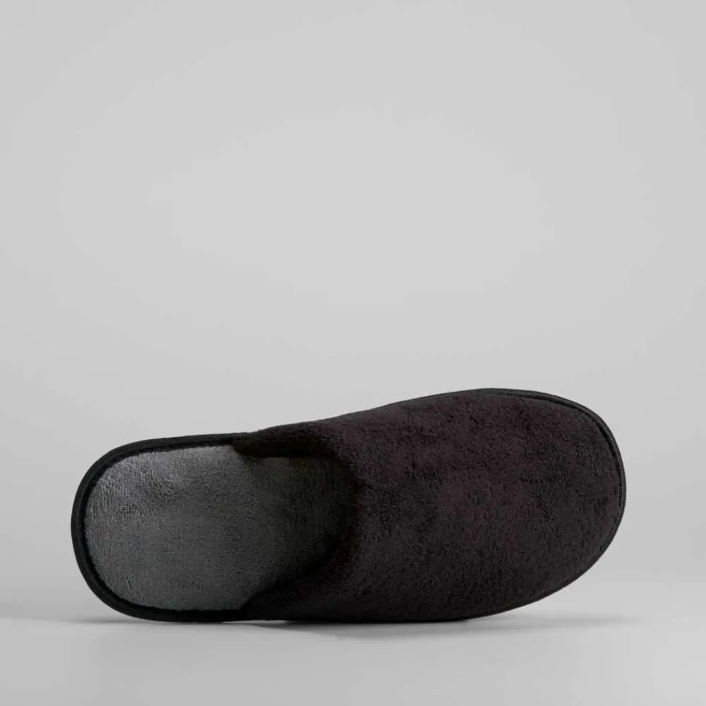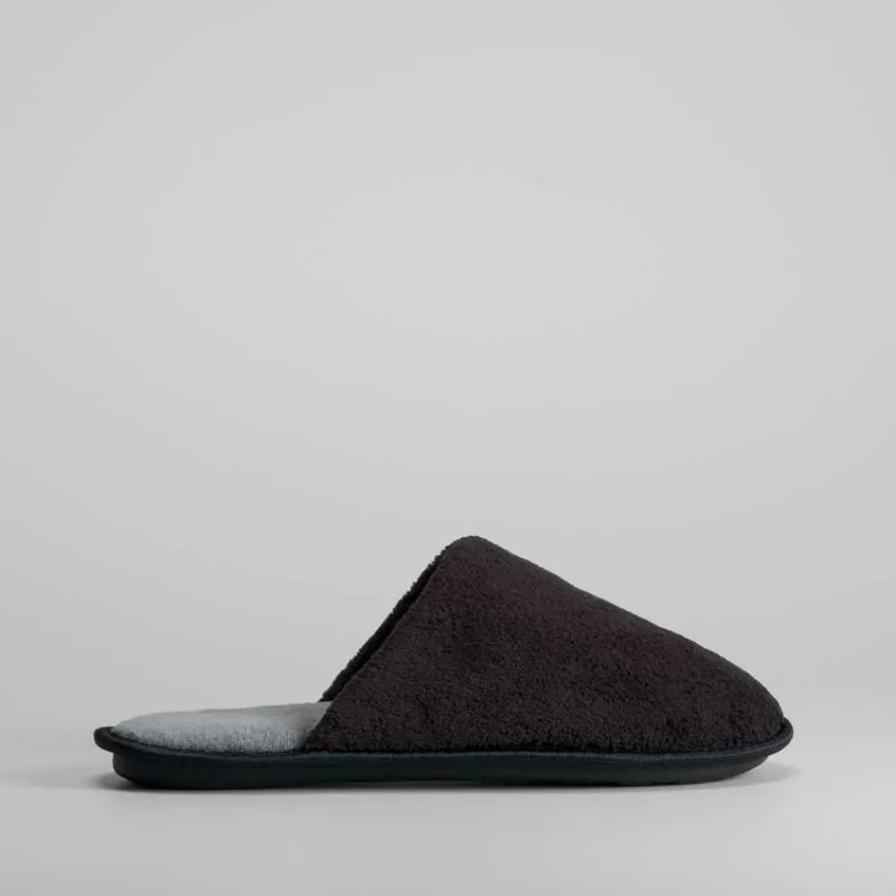 Zapatilla de casa básica y sencilla de la marca OLYNE. Corte textil en color negro y gris con la planta combinada.