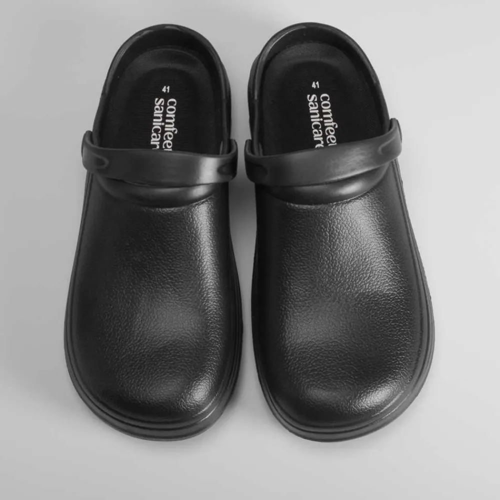 Zueco de trabajo para hombre en color negro de la marca COMFEET SANICARE. Diseño ligero con una tira trasera movible para un mayor ajuste. Plantilla extraíble y suela antideslizante.