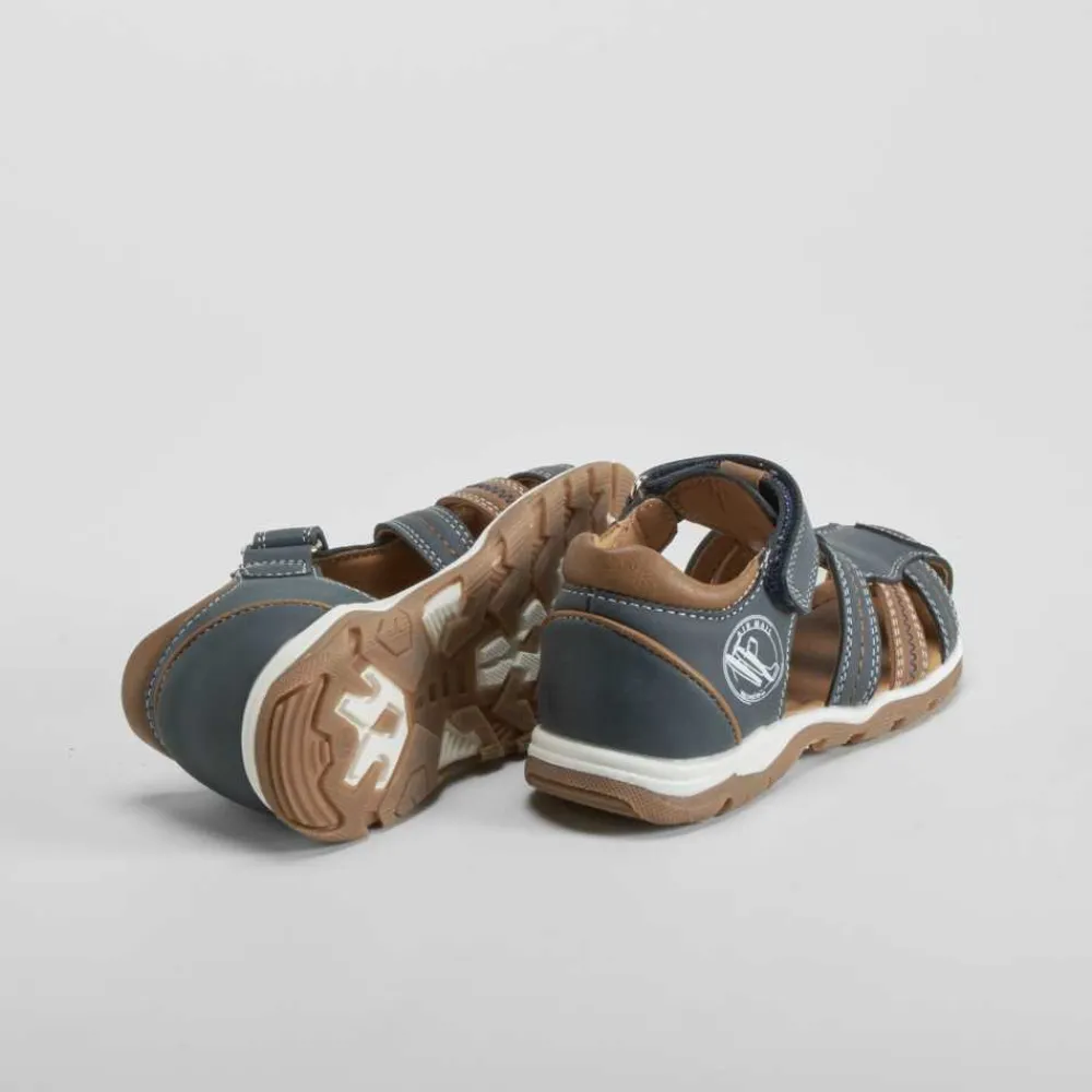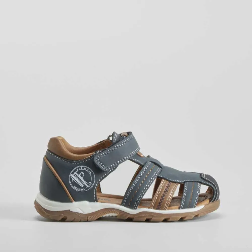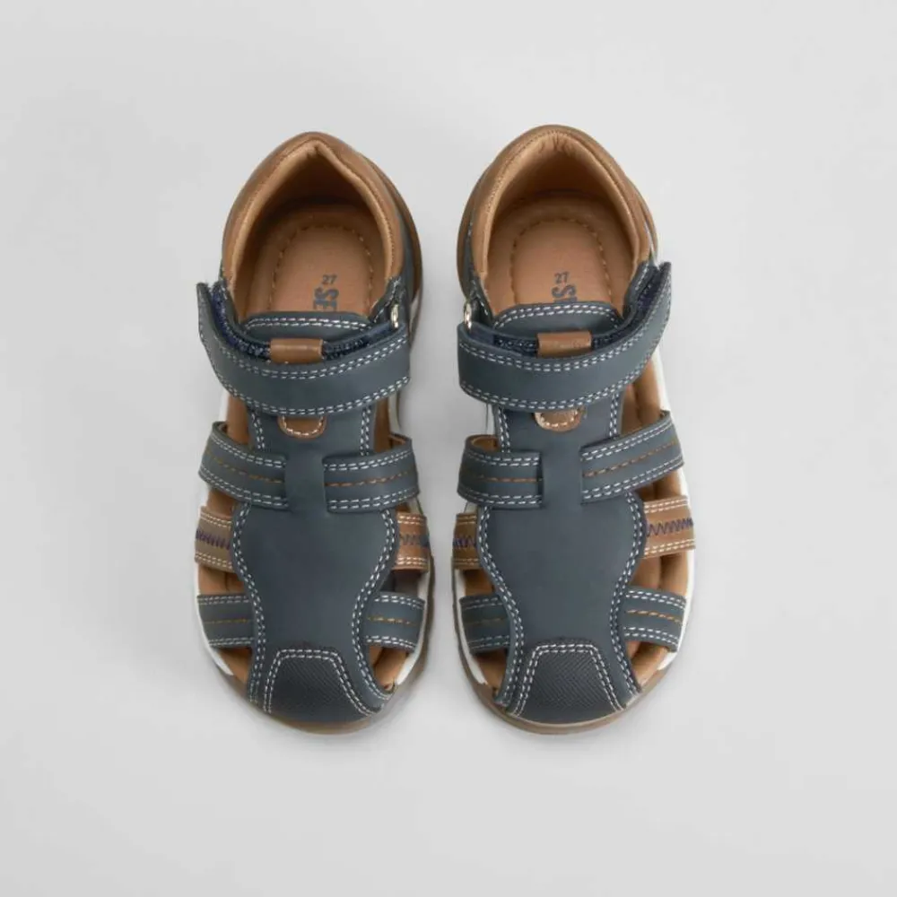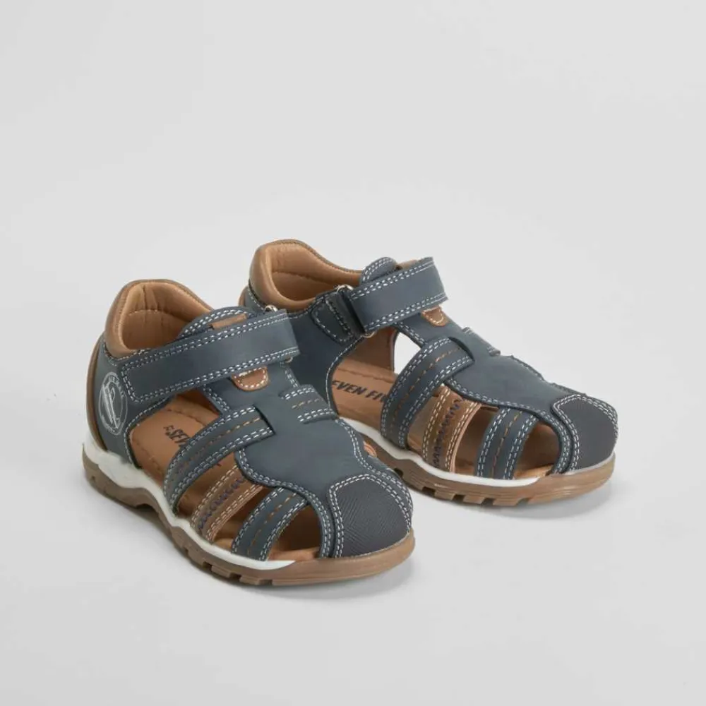Sandalia cerrada de vestir para niños de la marca SEVEN FIVE. Modelo en color azul con piezas y pespuntes en contraste. Cierre de velcro ajustable.
