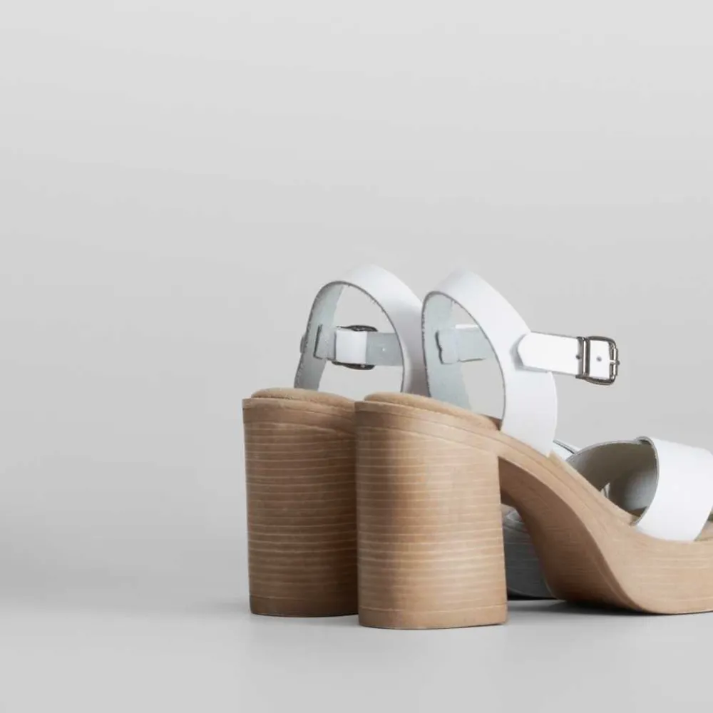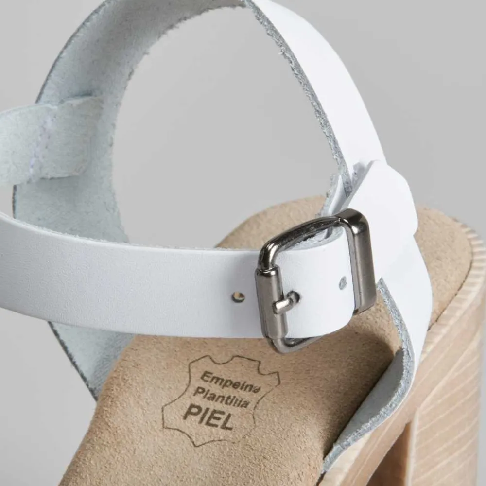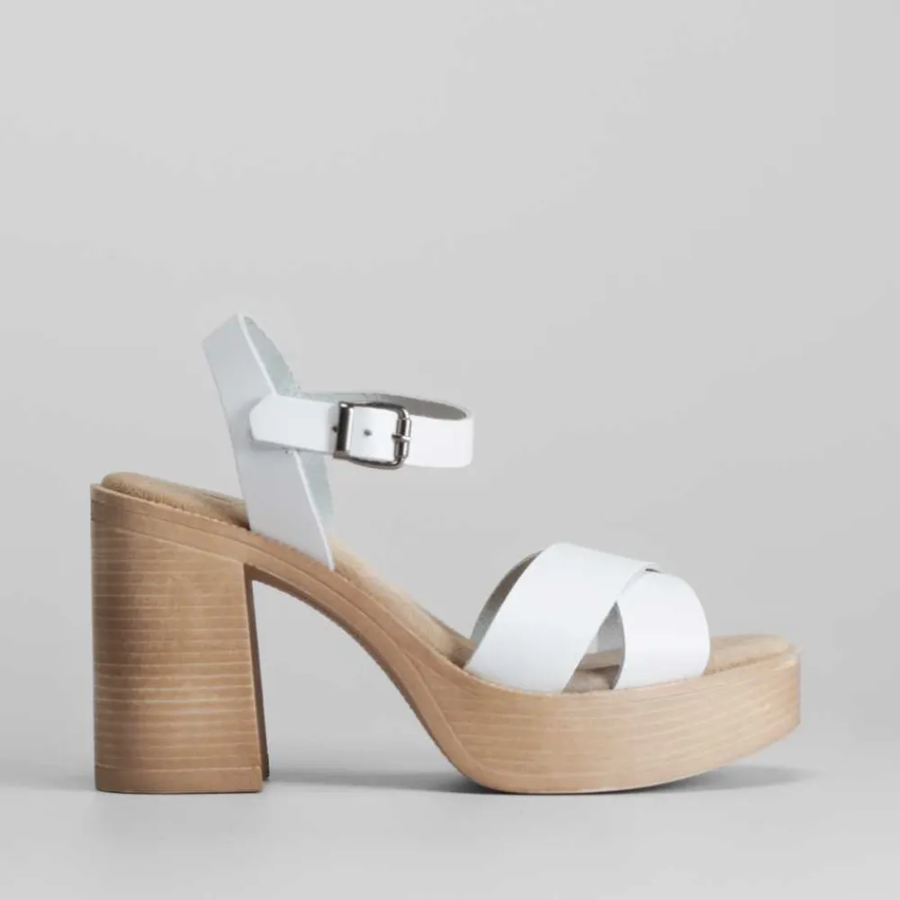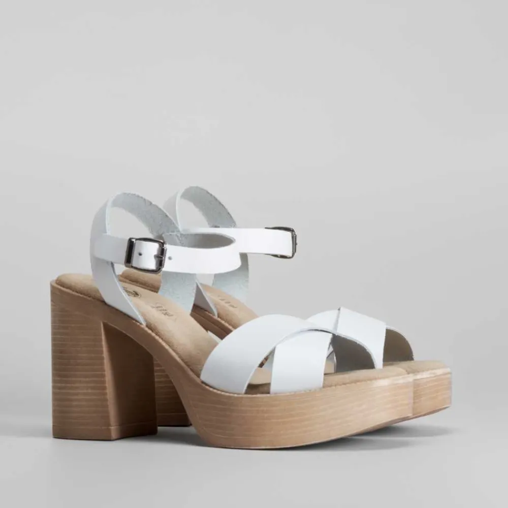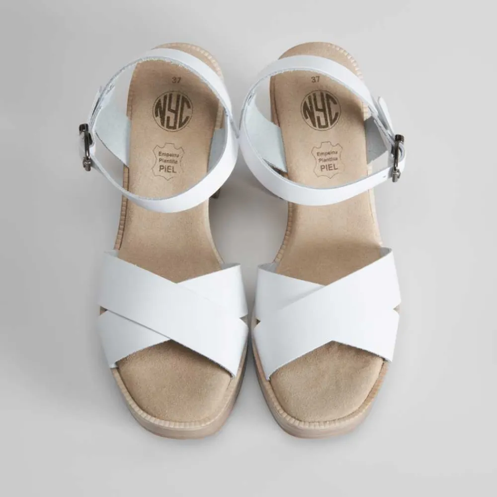 Sandalia de tacón alto con la pala cruzada de la marca NYC. Corte de piel en color blanco con cierre de hebilla y plantilla acolchada. Tacón de 9cm de altura. Hecho en España.