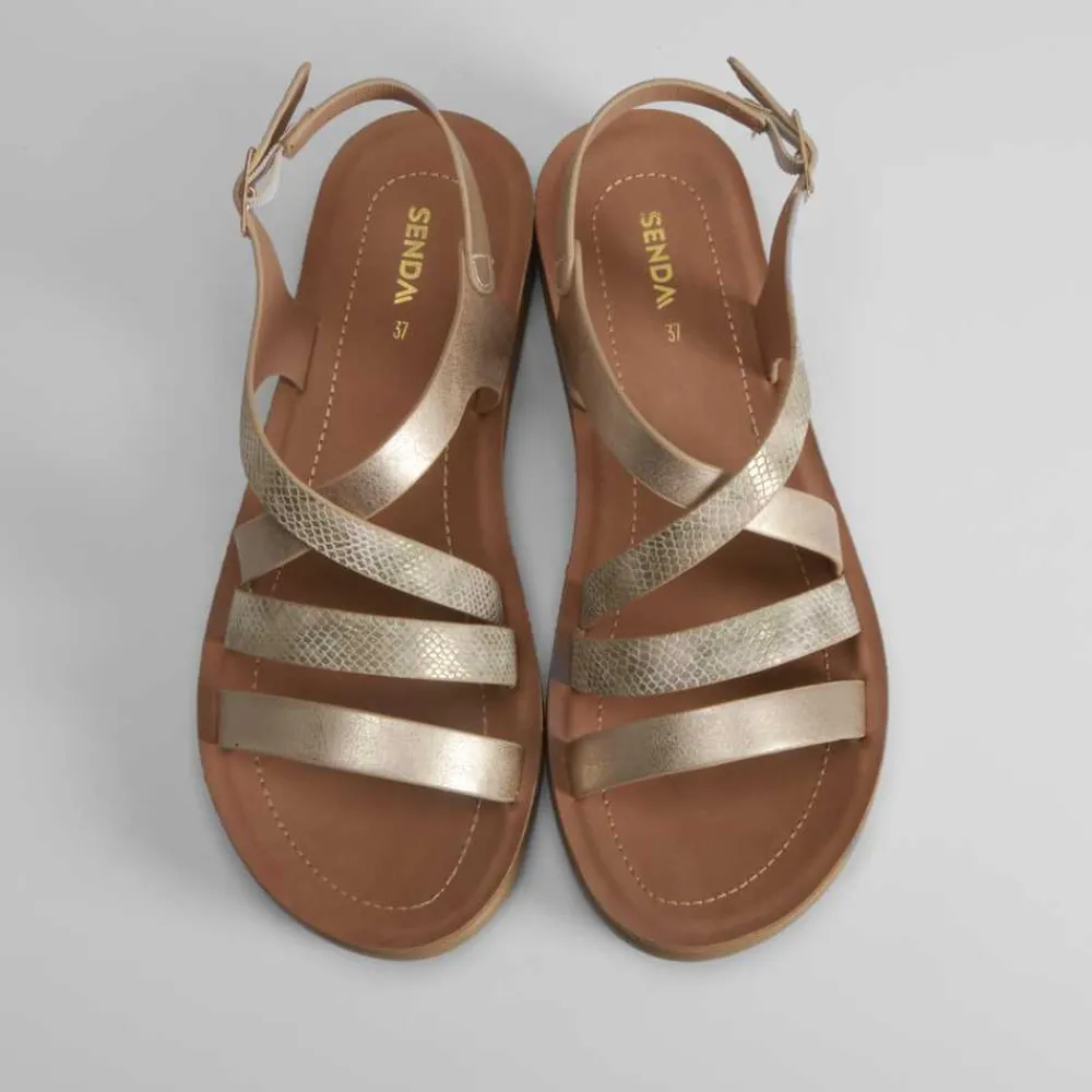 Sandalia plana básica de SENDA ROAD para mujer. Modelo dorado con tiras entrecruzadas con detalles grabados y hebilla en la parte posterior.
