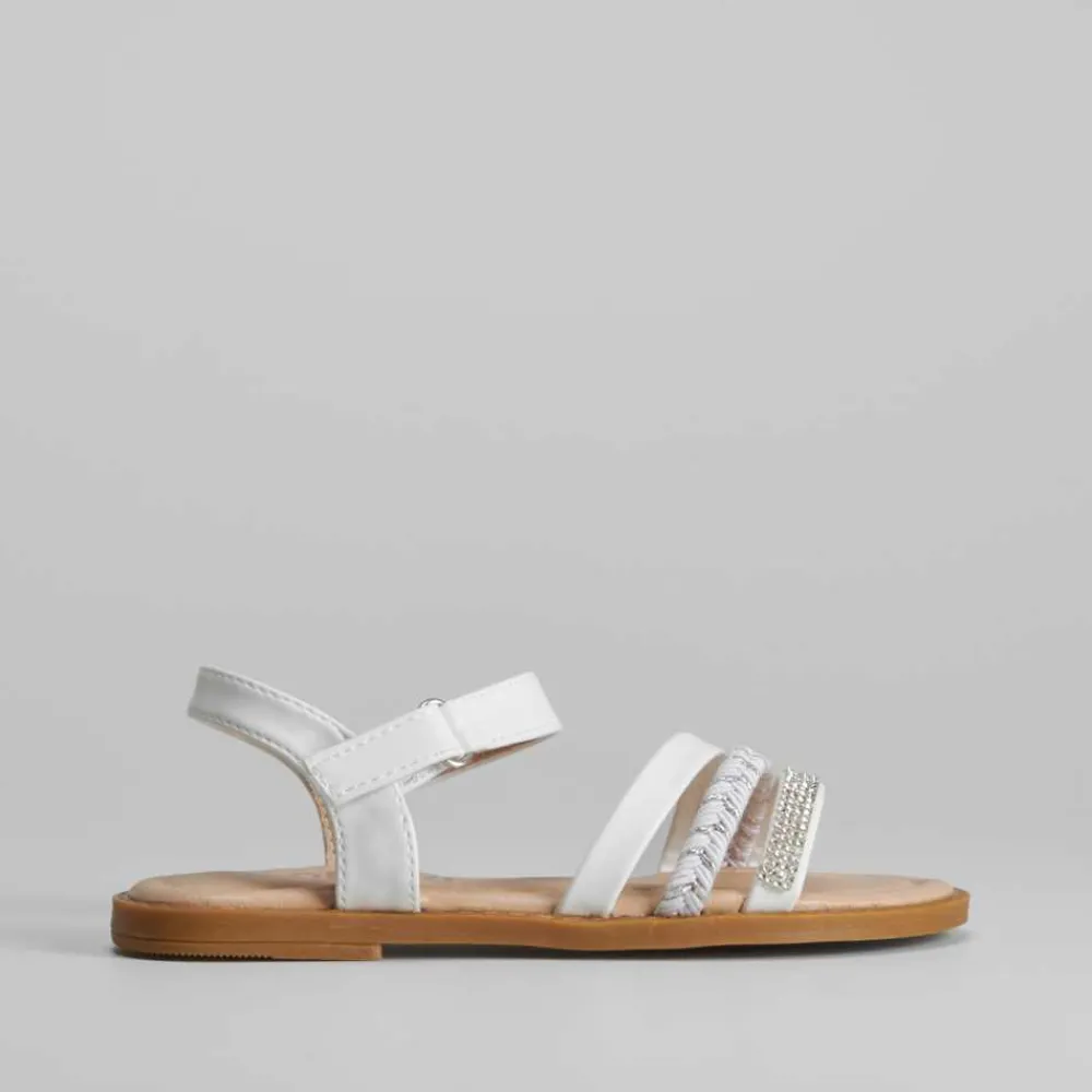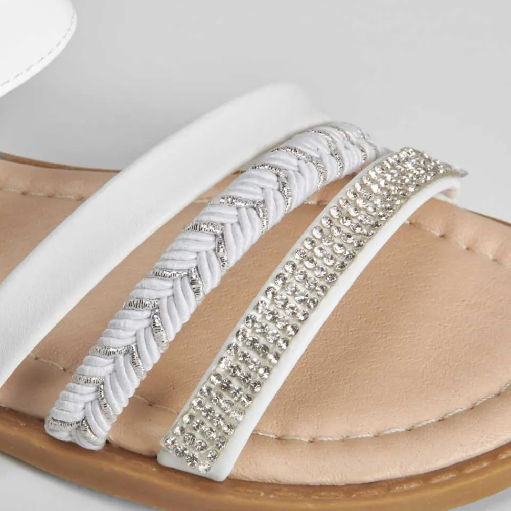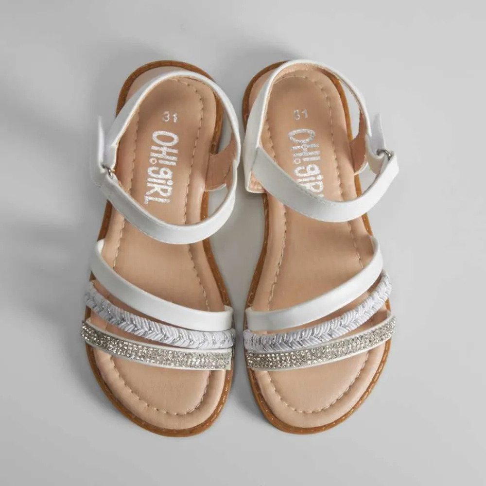 Sandalia plana infantil en color blanco de la marca OH GIRL. Pala adornada con tiras combinadas en diferentes materiales y acabados. Cierre de velcro.