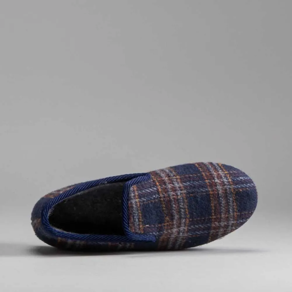 Zapatilla de estar por casa cerrada de la marca OLYNE para hombre con un diseño clásico. Modelo estampado a cuadros en tonos azul y suela de goma flexible. Hecho en España.