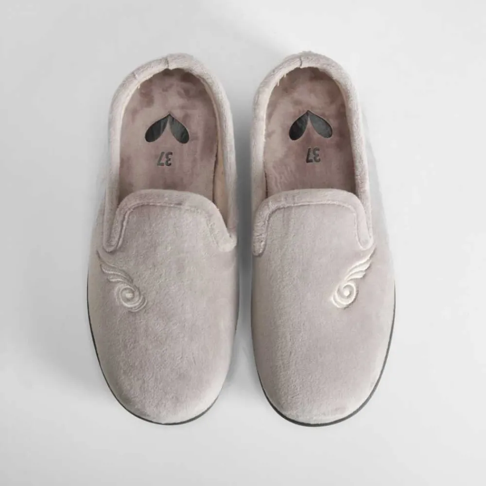 Zapatilla de casa para mujer cerrada de la marca COMFEET. Modelo en color beige con un bordado en la pala y planta acolchada extraíble. Hecho en España.