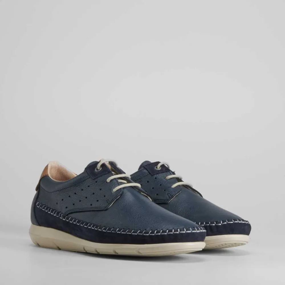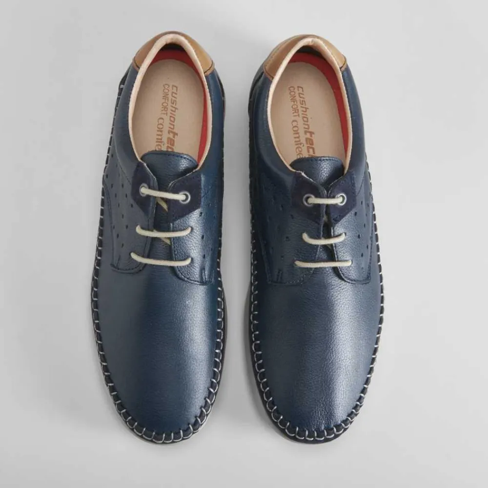 Blucher de piel de la marca COMFEET para hombre en color azul marino. Hecho en España. COMFORT+: Plantilla ergonómica termoconformada que reparte el peso del cuerpo por toda la superficie aliviando así nuestros pies. Suela superflex que absorbe el impacto en cada pisada.