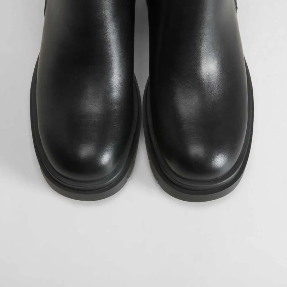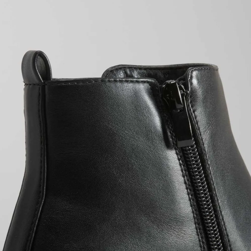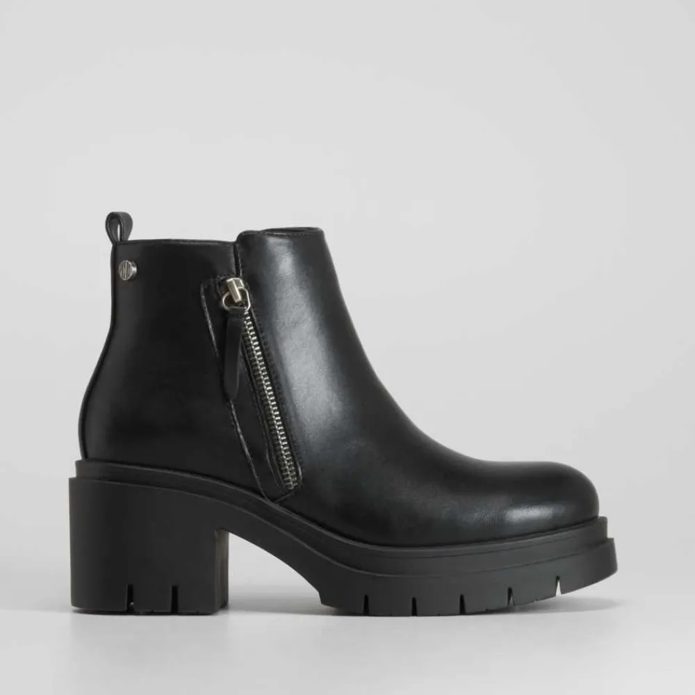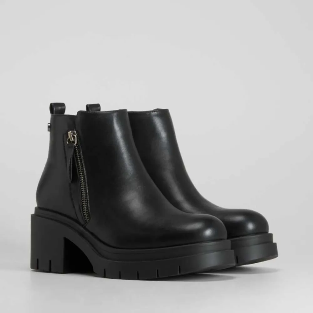 Botín bajo con cremalleras de la marca NYC para mujer. Corte en color negro con un tirador en la parte posterior. Tacón de 7cm de altura.