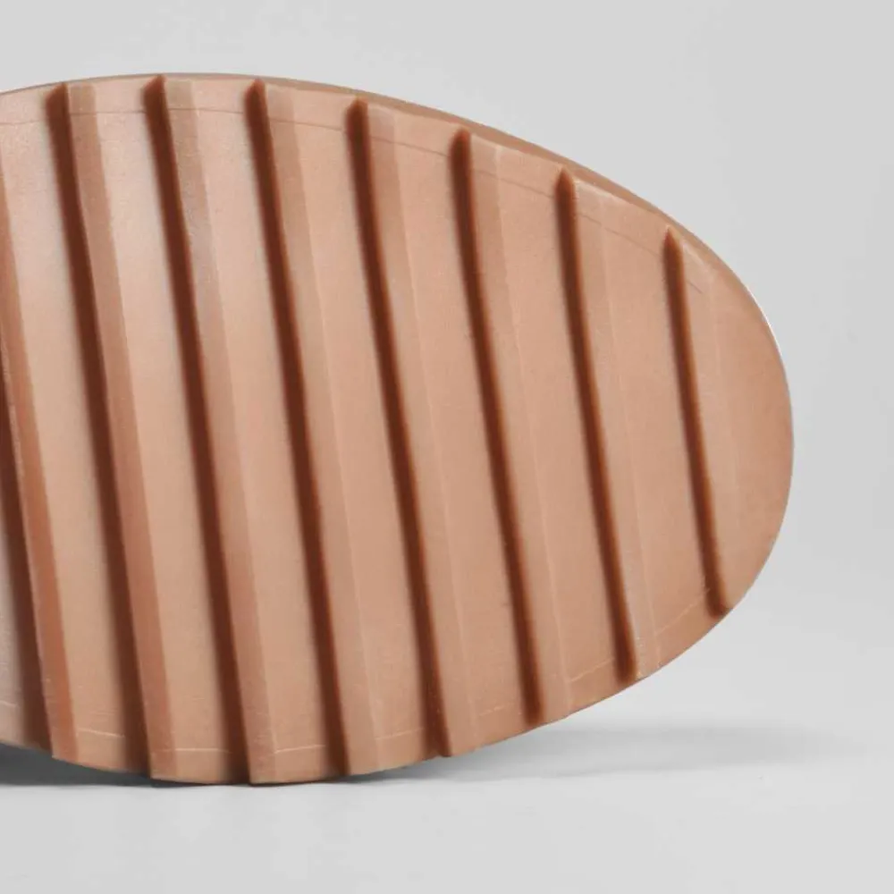 La suela de goma antideslizante está diseñada para garantizar un agarre firme en superficies húmedas o nevadas. La plataforma añade altura y estilo, al mismo tiempo que distribuye la presión del peso corporal, ofreciendo mayor comodidad en cada paso.