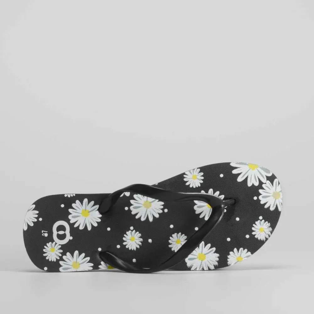 Chancla de playa con tira entrededo de COCONUT DRIVE para mujer. Modelo en color negro con print de margaritas.
