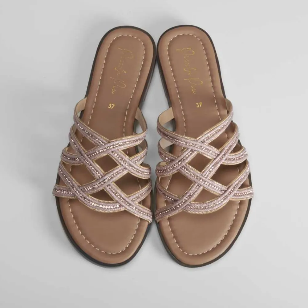 Sandalia plana destalonada de color rosa de PICCOLA PIU. Pala adornada con tiras finas entrecruzadas con strass.