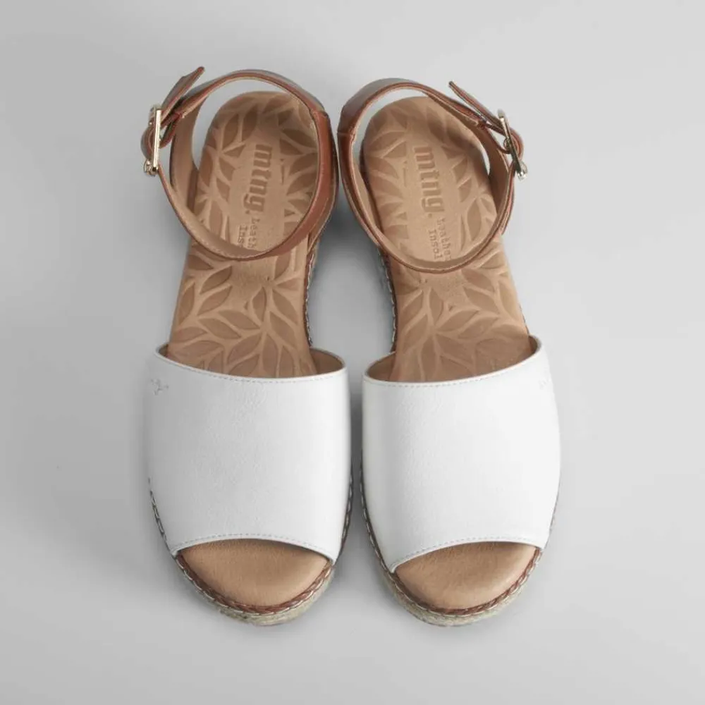 Sandalia menorquina con plataforma de esparto de la marca MUSTANG. Corte en color blanco con pulsera tobillera con cierre de hebilla.