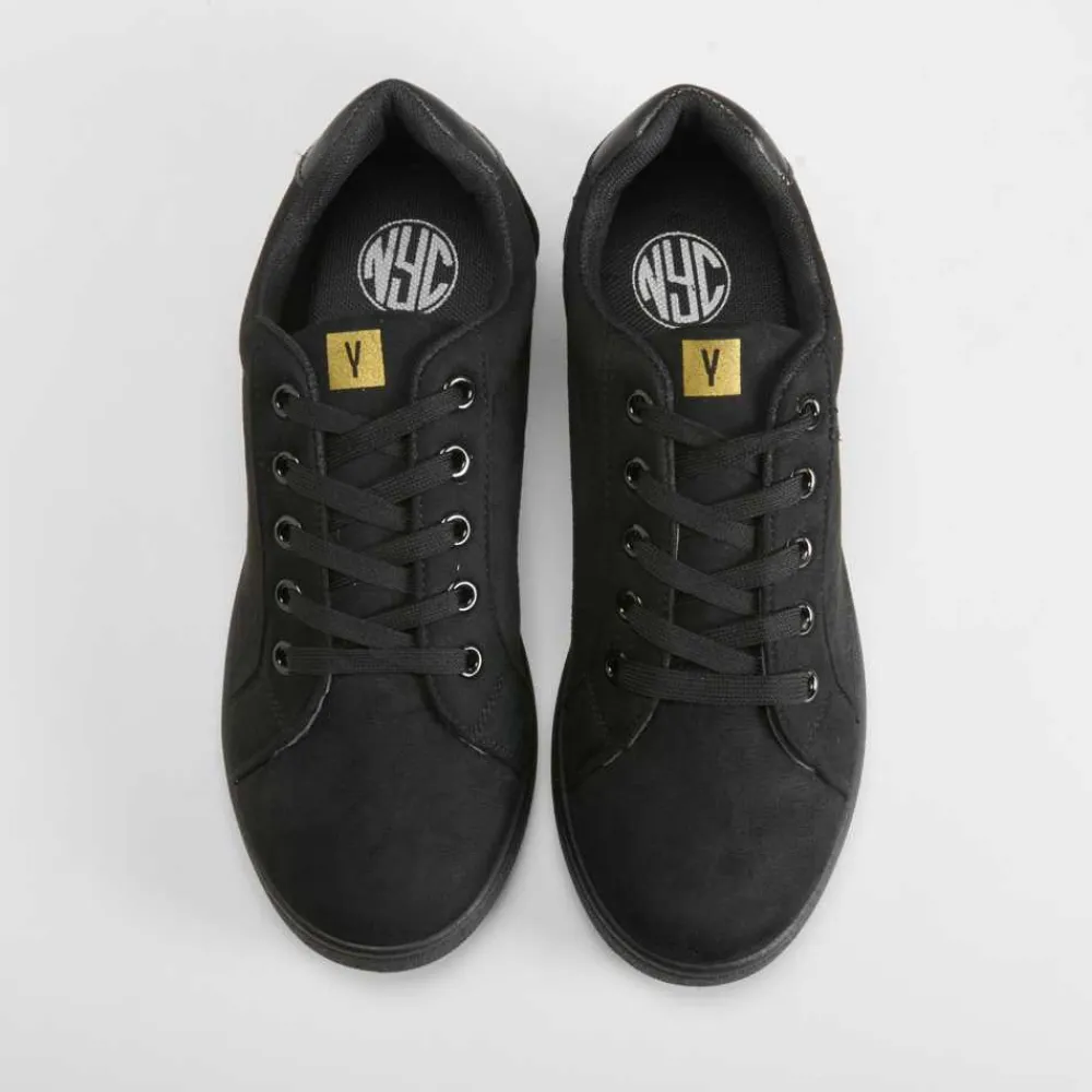 Zapatilla urbana de la marca NYC para mujer. Exterior en color blanco , camel y negro con piezas superpuestas entonadas. Detalle en forma de Y en el lateral. Cierre de cordones combinados.