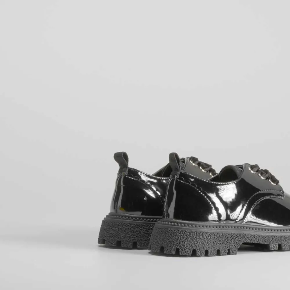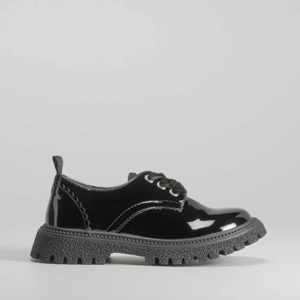Blucher en charol para niñas de la marca OH GIRL. Corte en color negro con cordones aterciopelados y suela dentada.