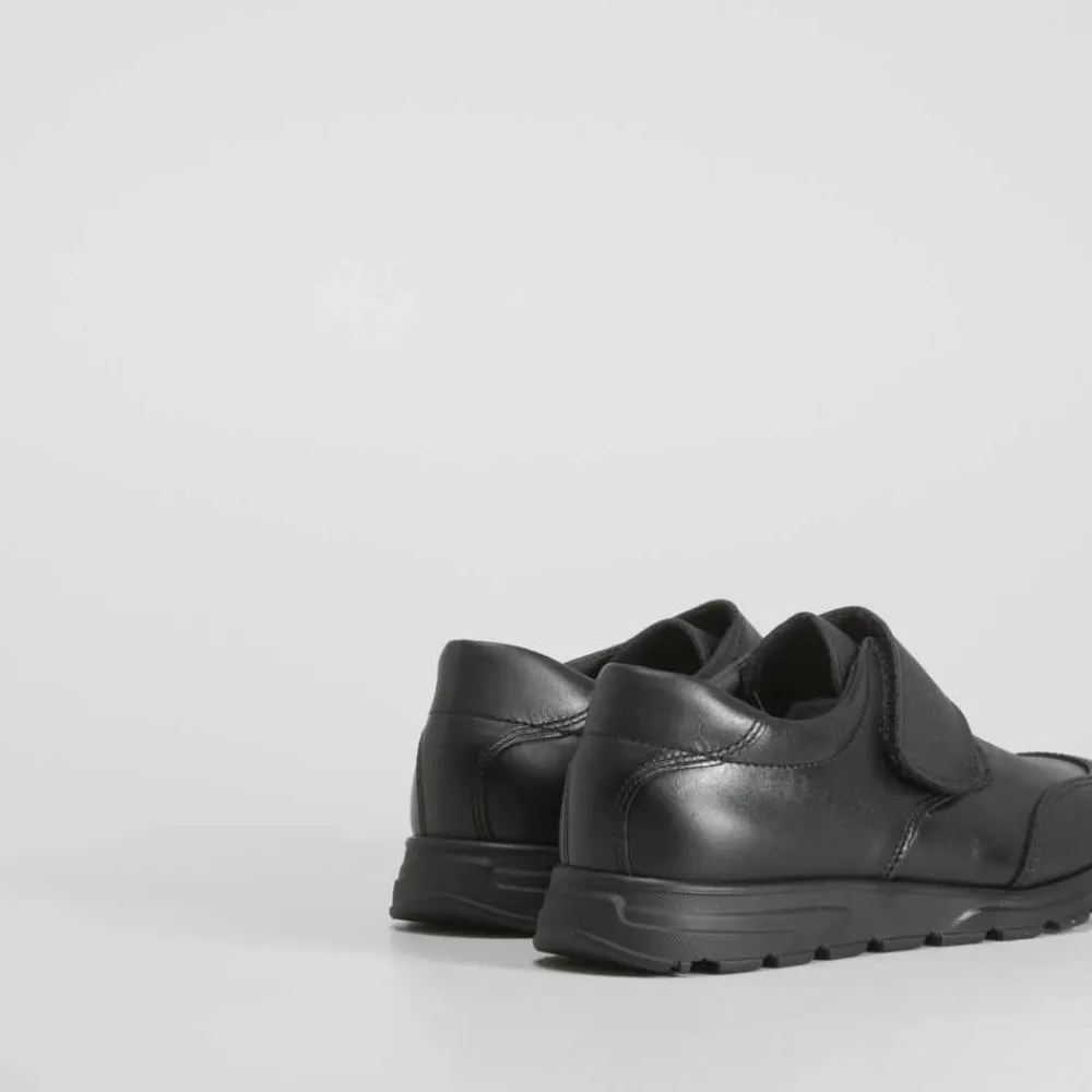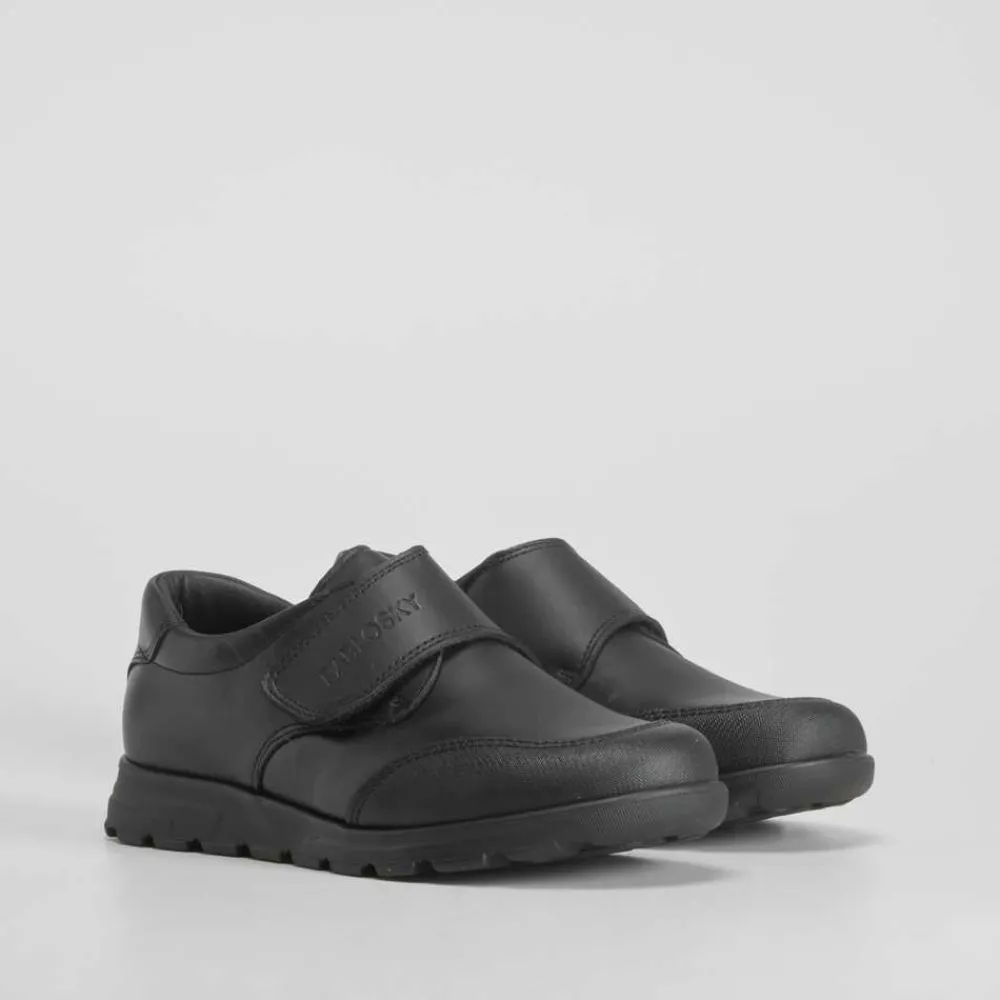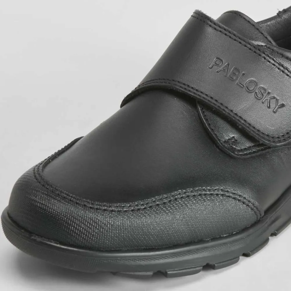Zapato colegial de PABLOSKY confeccionado en piel en color negro. Tira de velcro ancha y puntera reforzada.