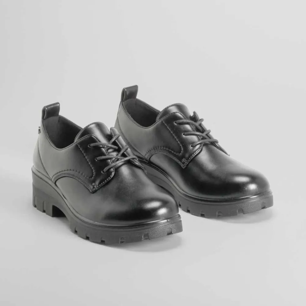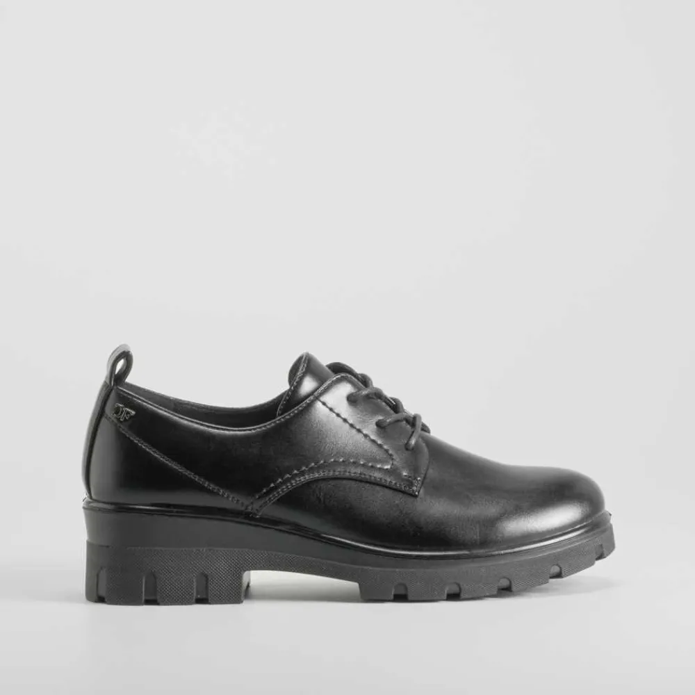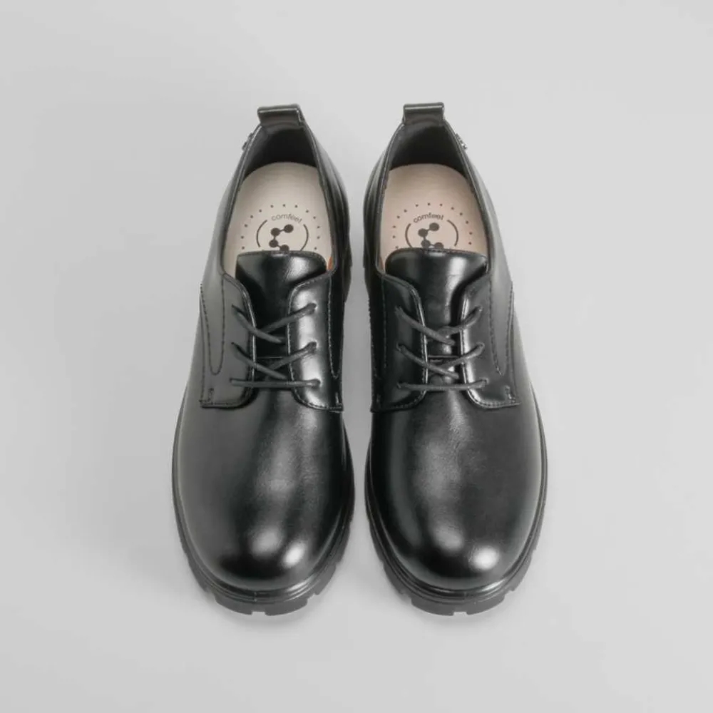 Blucher negro de tacón ancho y bajo de la marca COMFEET. Modelo cordones encerados y tirador en la parte posterior.