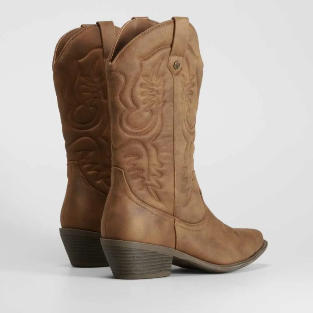 Bota campera alta para mujer de la marca NYC. Exterior grabado en color beige con pespuntes combinados y cierre de cremallera lateral. Suela con tacón bajo.