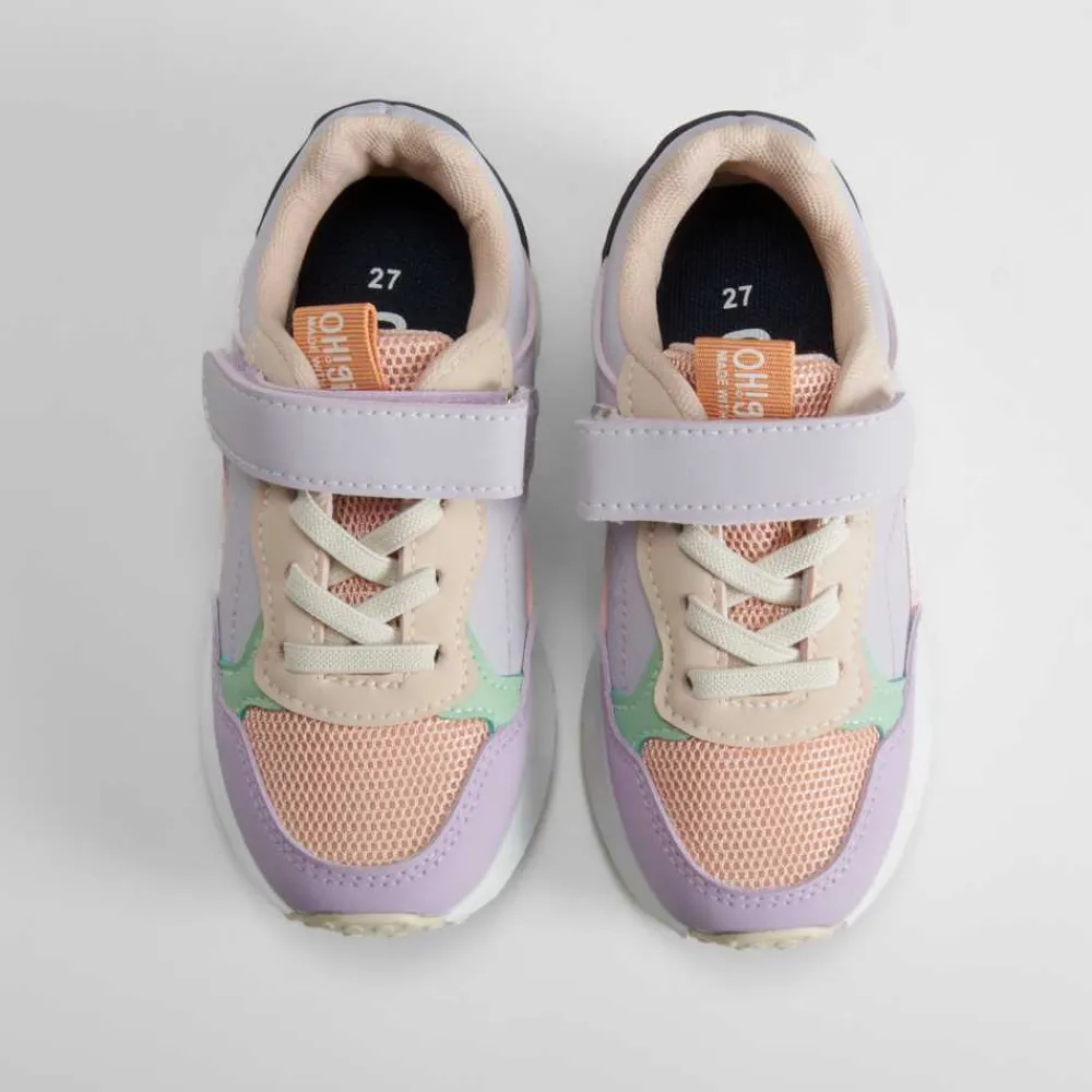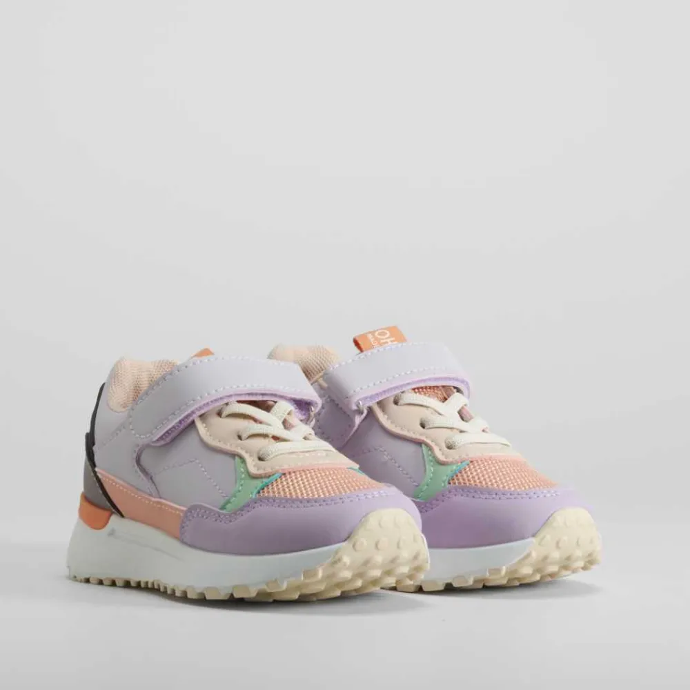 Zapatilla deportiva retrorunning multicolor para niñas. Modelo con cordones elásticos y tira de velcro ajustable.