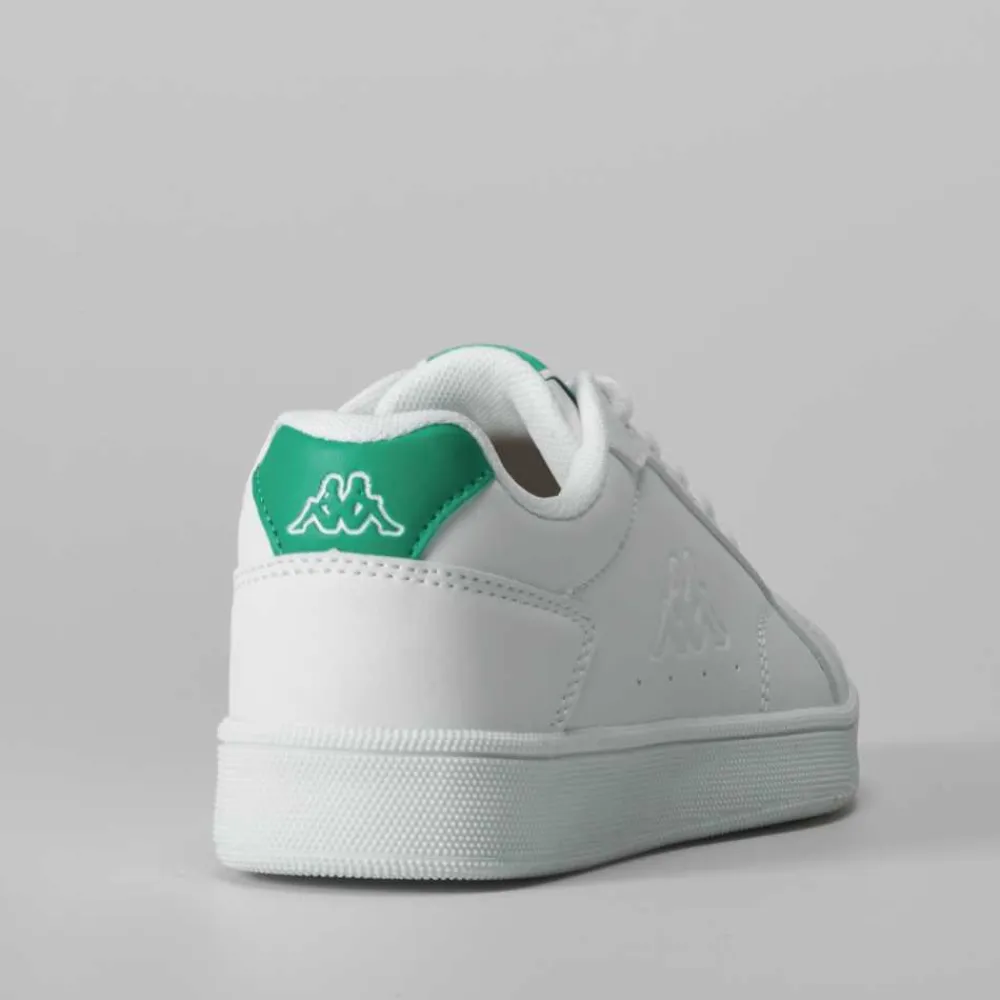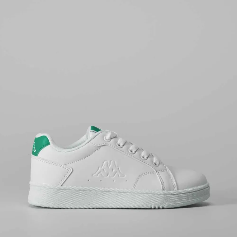 Zapatilla tenis de KAPPA para niños en color blanco. Modelo clásico con cierre de cordones y detalles contrastados en verde.
