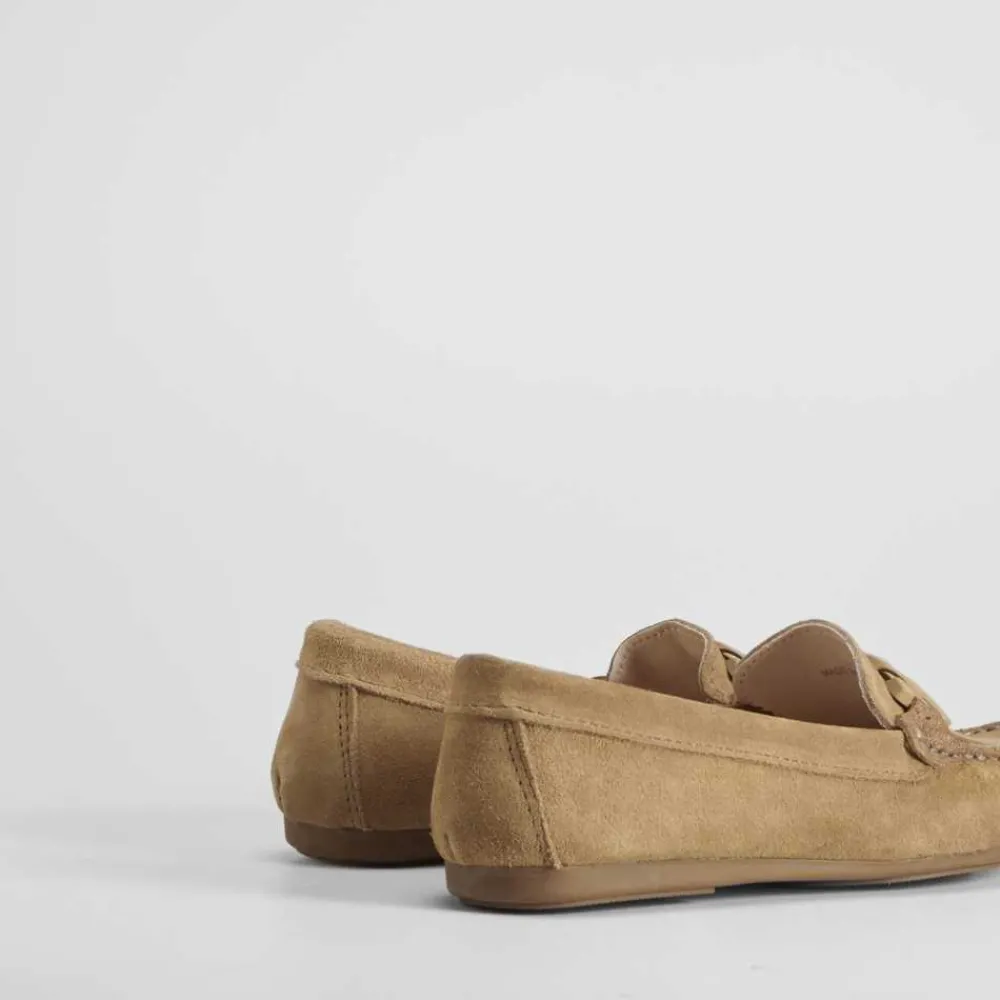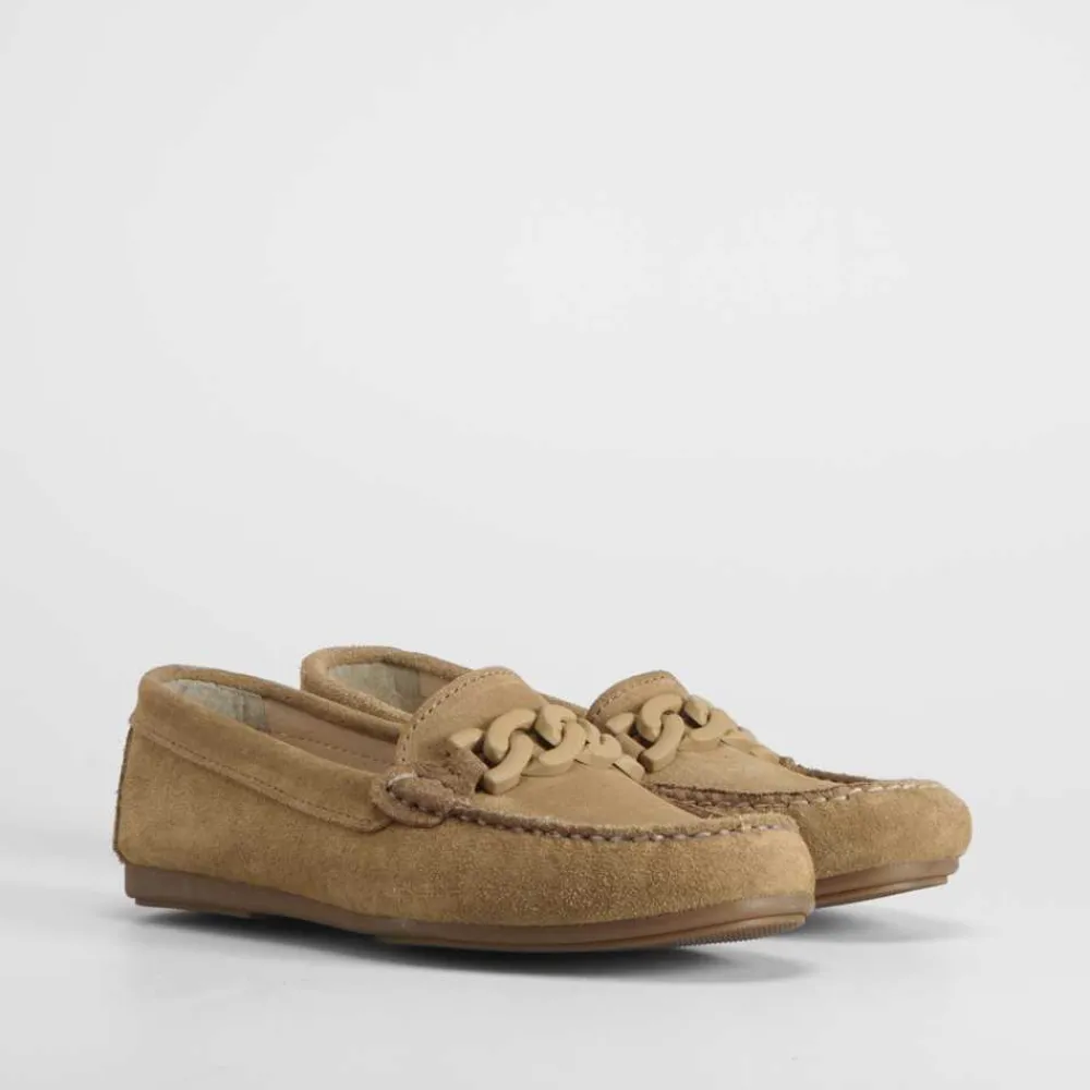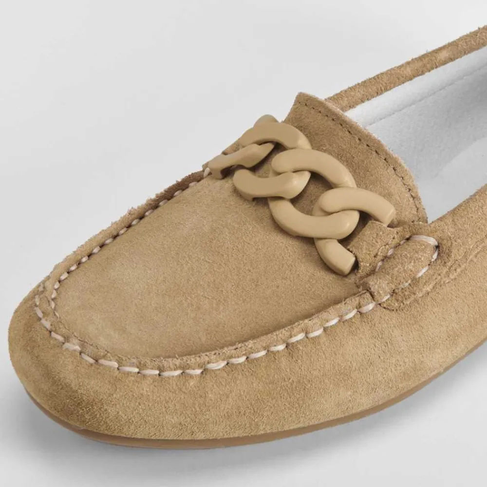 Mocasín de la marca FOSCO. Modelo en color taupe con pespuntes contrastados y cadena decorativa en la puntera. Hecho en España.