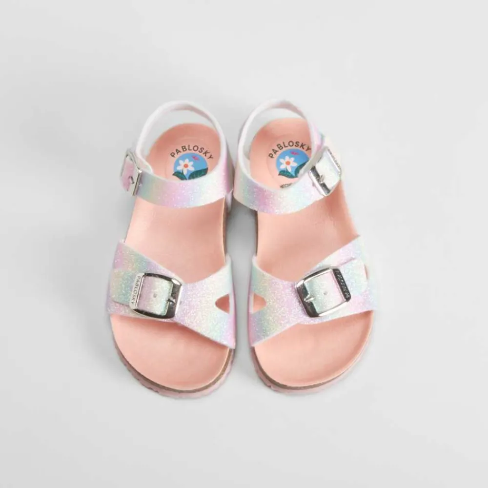 Sandalia bio para niñas de glitter multicolor de la marca PABLOSKY. Modelo confeccionado con materiales reciclados y cierre de hebilla. Planta de corcho flexible y absorbente para un mayor confort. Piso de goma flexible y antideslizante. Hecho en España.
