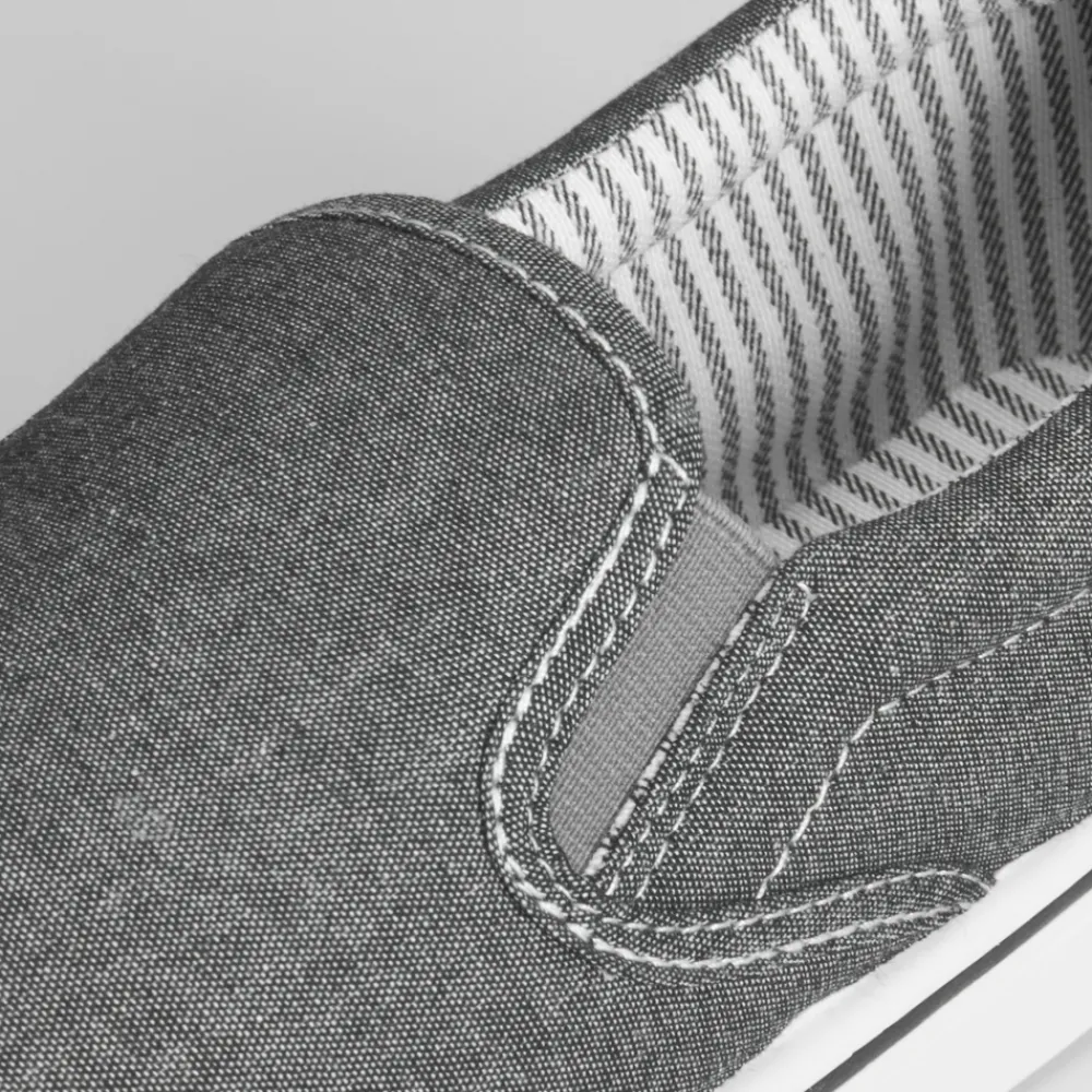 Zapatilla slip on básica de NYC para hombre. Exterior en color gris oscuro con cosidos contrastados y dos elásticos cómodos y funcionales. Cuello acolchado y piso de caucho.