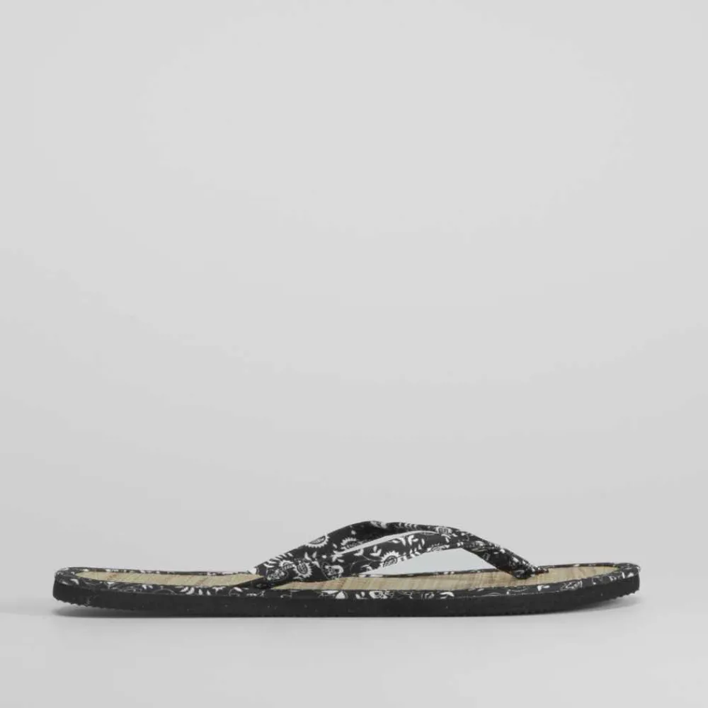 Chancla negra de la marca COCONUT DRIVE. Tira entrededo y ribete adornada con estampado y planta efecto tatami.