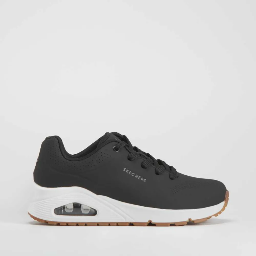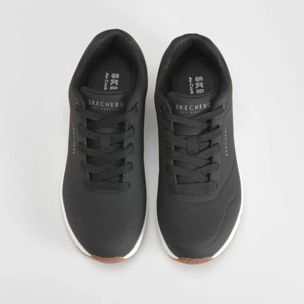 Zapatilla urbana cómoda y funcional SKECHERS STREET Uno Stand on Air en color negro. Corte sencillo con pequeños perforados y cierre de cordones combinados. Plantilla Air Cooled Memory Foam muy confortable y cámara de aire para una mayor amortiguación.