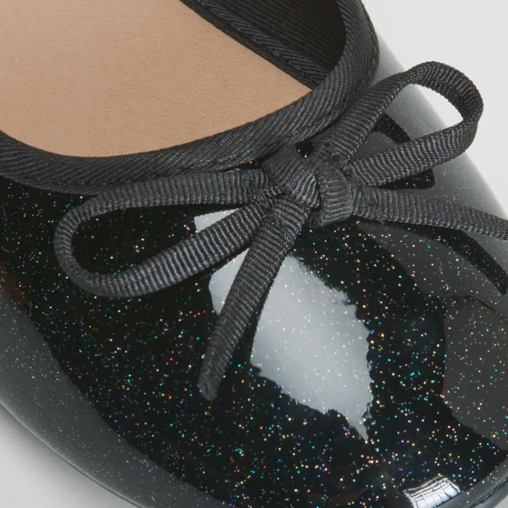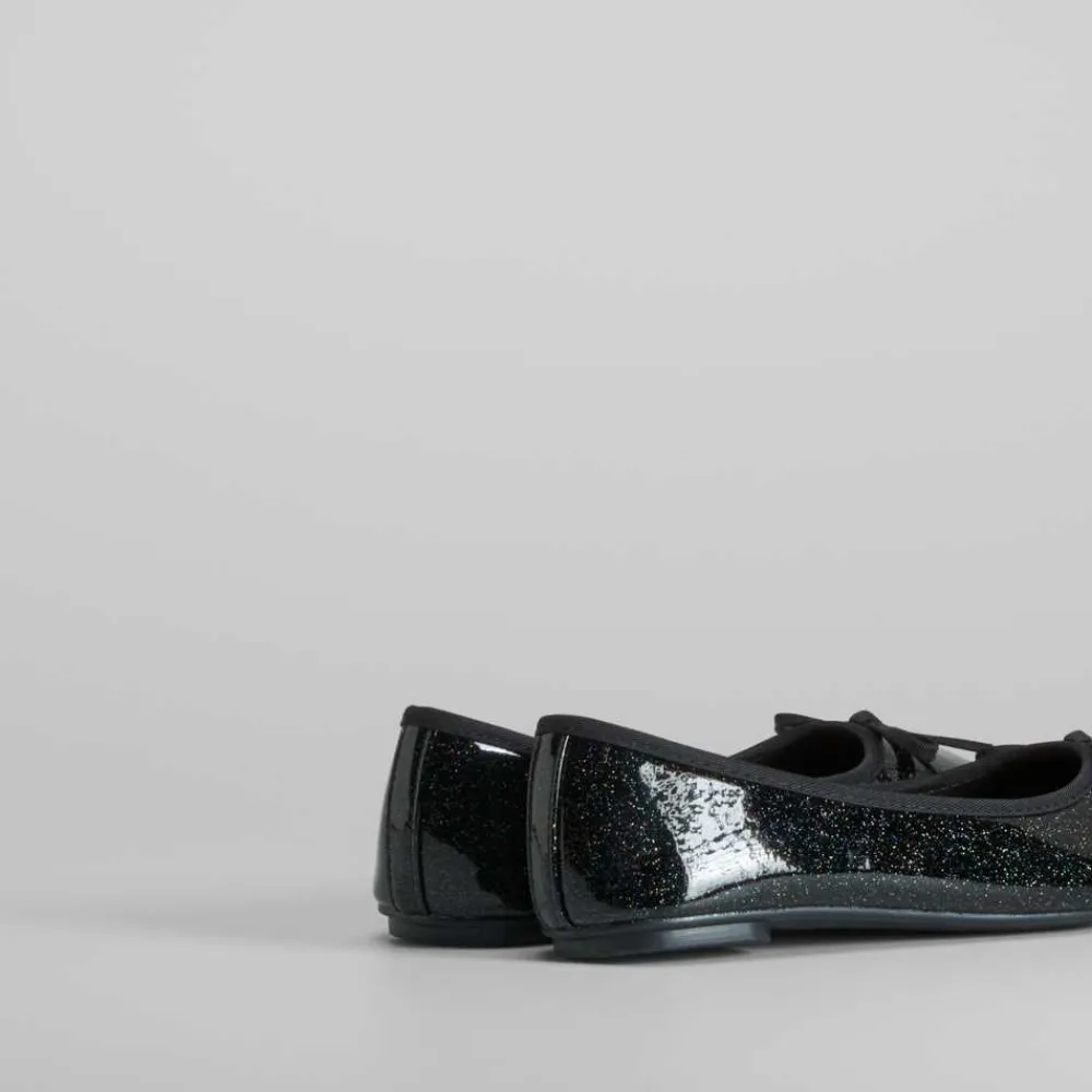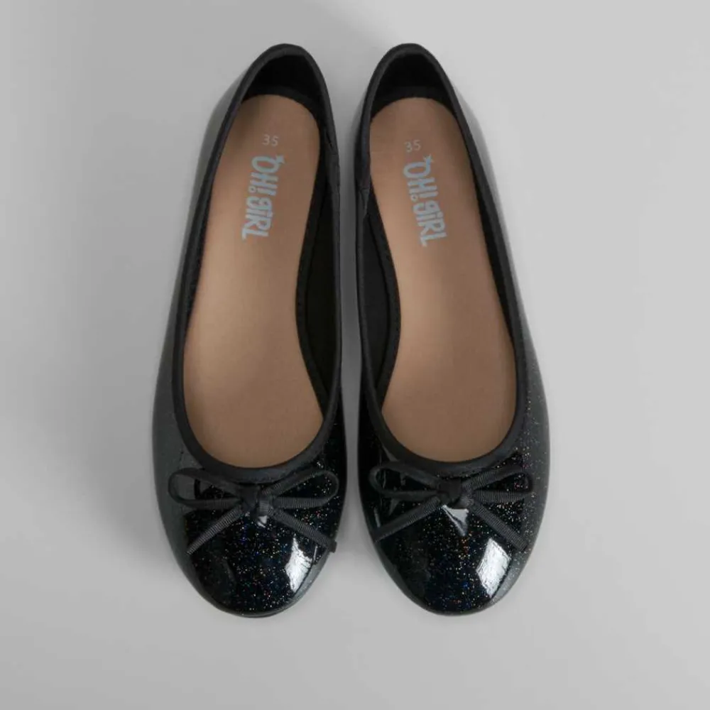 Bailarina básica infantil de la marca OH GIRL. Modelo en color negro con acabado brillante y lazo de adorno en la puntera.
