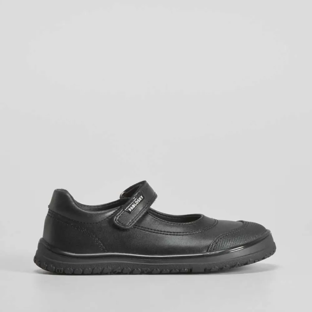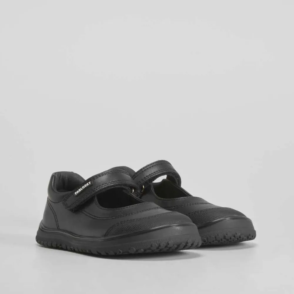 Mercedita colegial de PABLOSKY en piel de color negro para niñas. Puntera reforzada y tira de velcro ajustable.