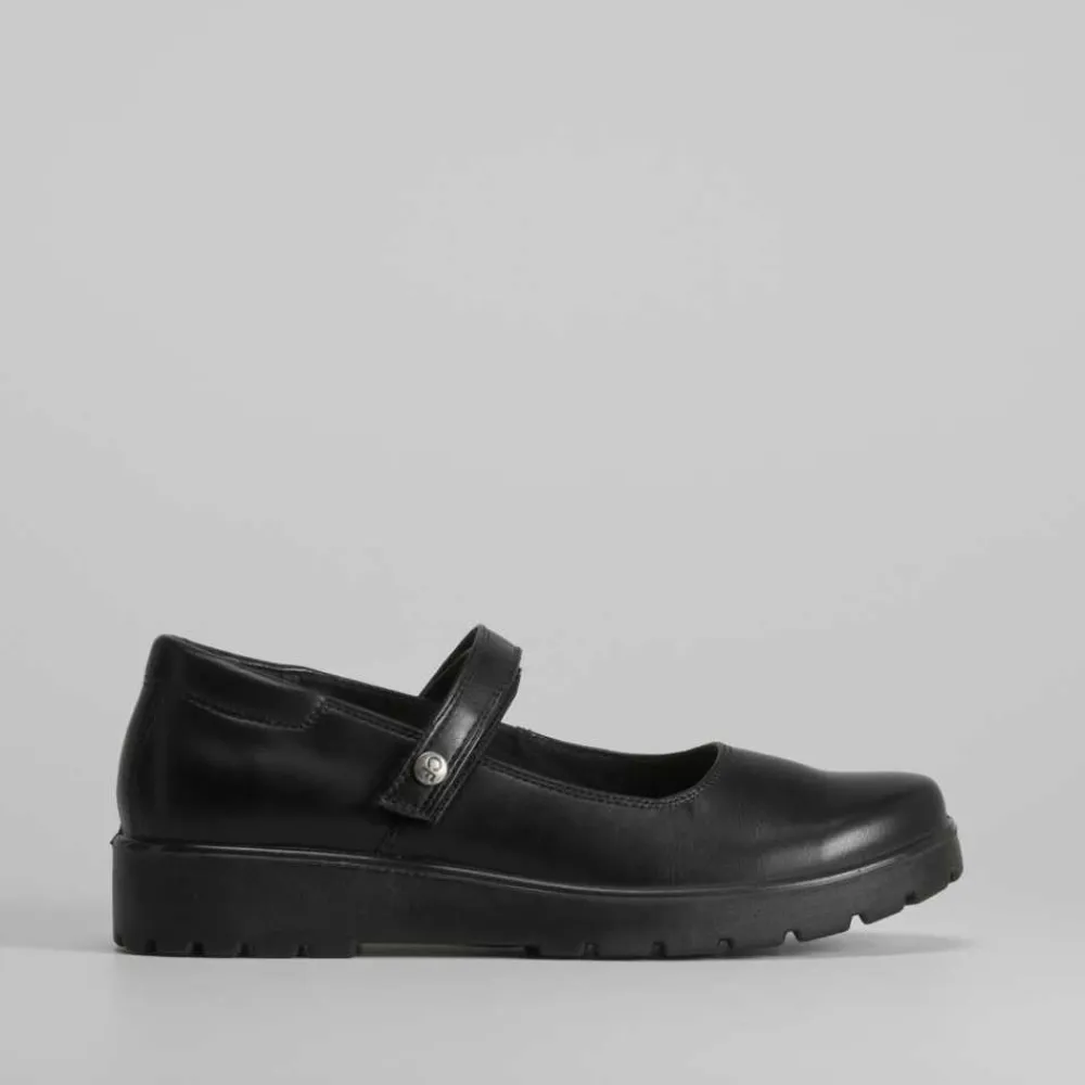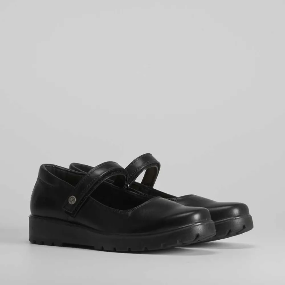 Mercedita de cuña baja en color negro de la marca COMFEET. Diseño ligero y confortable con una tira de velcro en el empeine para una mayor sujeción. Tecnología Soft Insock: La plantilla Soft Insock se adapta a la forma natural de la pisada, descansando mientras caminas gracias a su diseño anatómico High Intensity Foam que permite recuperar su forma en cada paso.