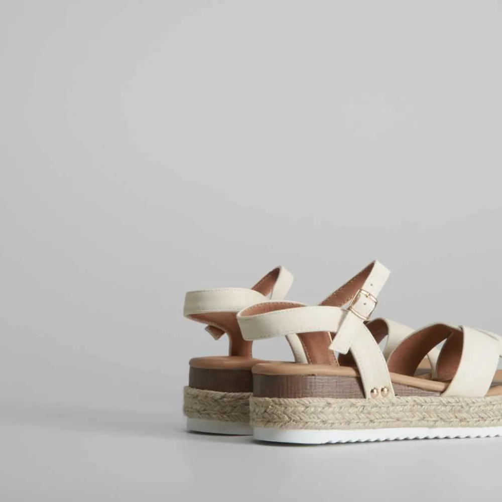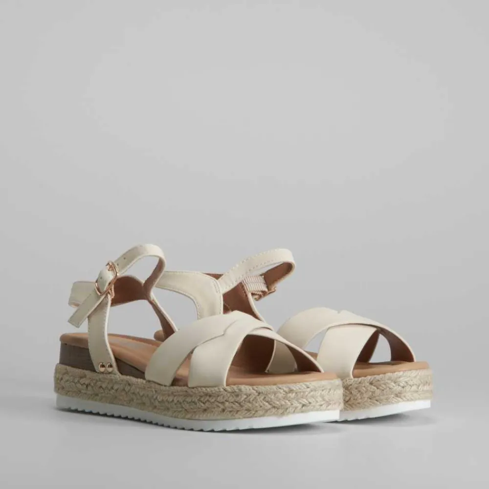 Sandalia con cuña de esparto baja para niñas de la marca OH GIRL. Corte en color blanco con la pala cruzada y cierre de hebilla.