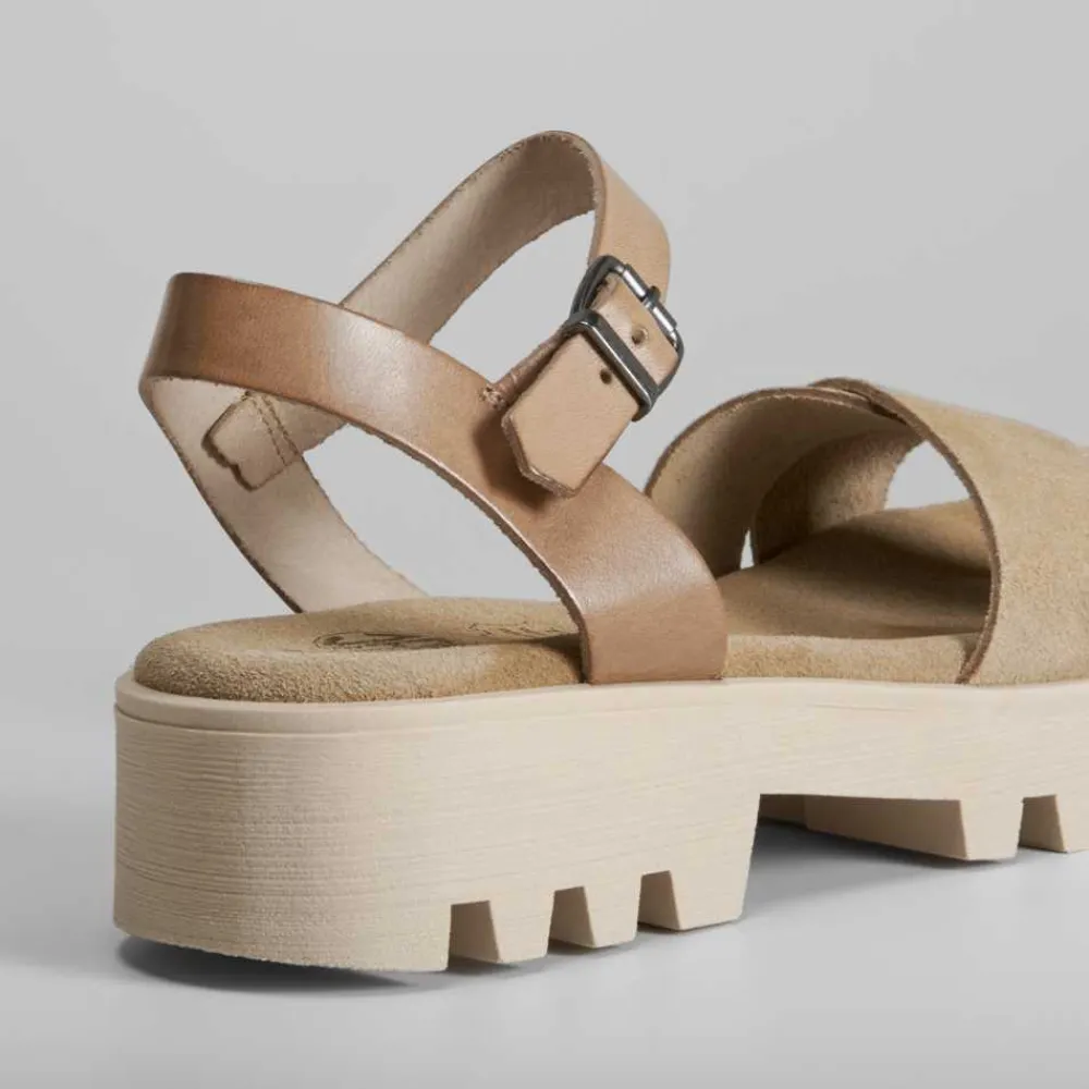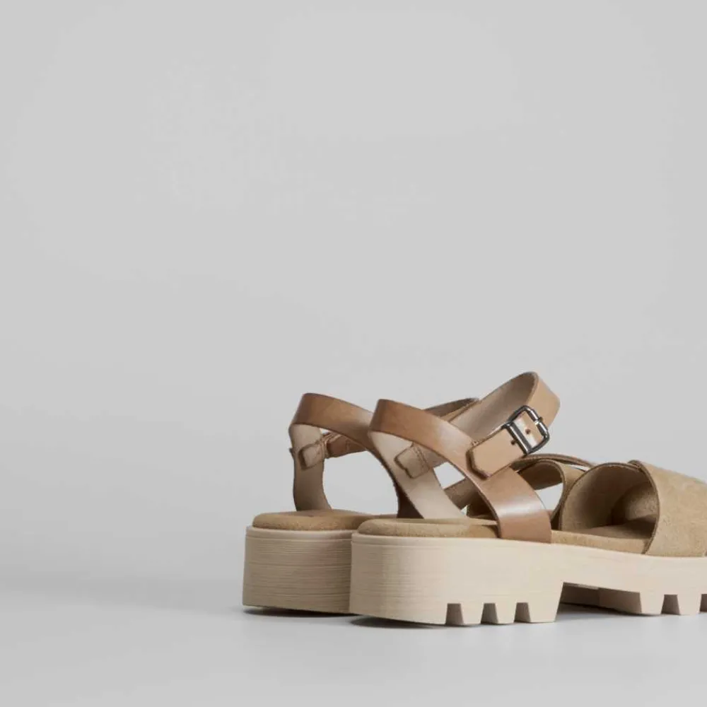 Sandalia de tacón track de la marca NYC para mujer. Modelo confeccionado en piel con la pala cruzada en color beige y pulsera con cierre de hebilla ajustable. Planta de gel acolchada muy confortable y tacón de 5cm de altura. Hecho en España.