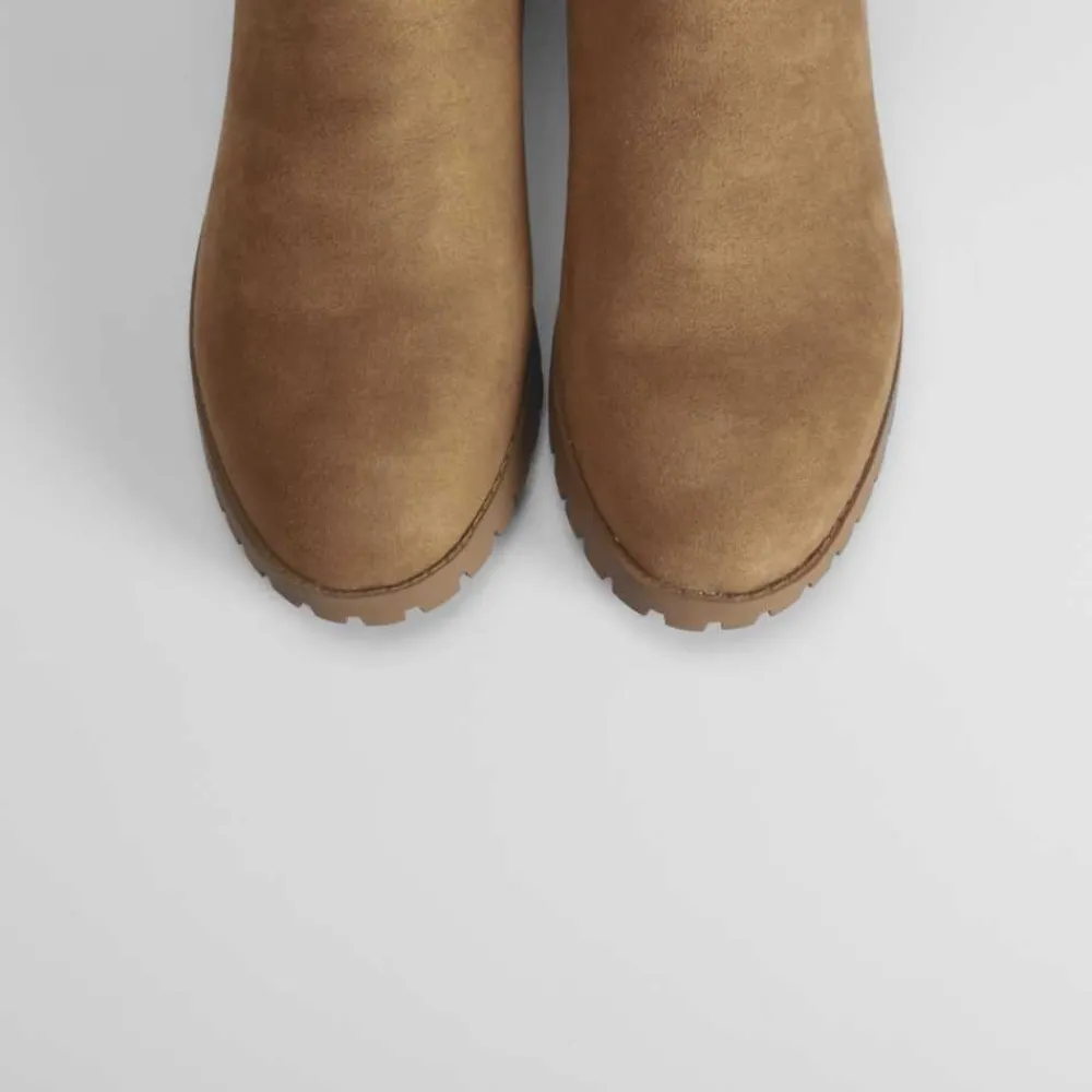 Botín chelsea básico con tacón track de la marca NYC para mujer. Exterior en color cuero con dos elásticos laterales para un calce sencillo y un look a la última. Tacón dentado de 5cm de altura. .esle