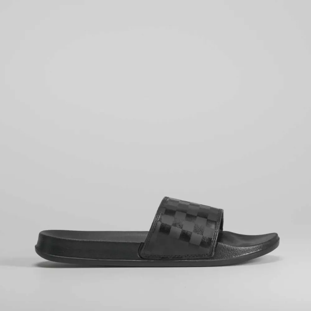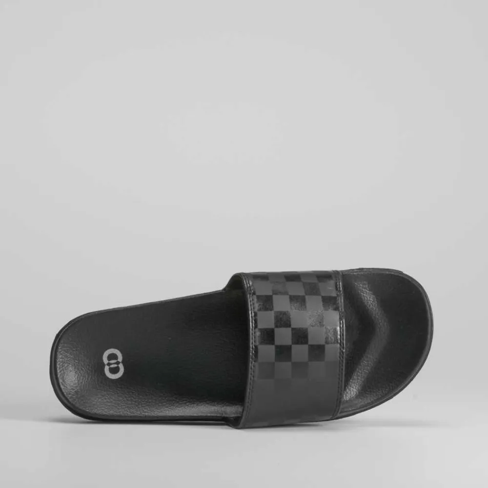 Chancla de playa en color negro de la marca COCONUT DRIVE con estampado a cuadros negros en la pala.