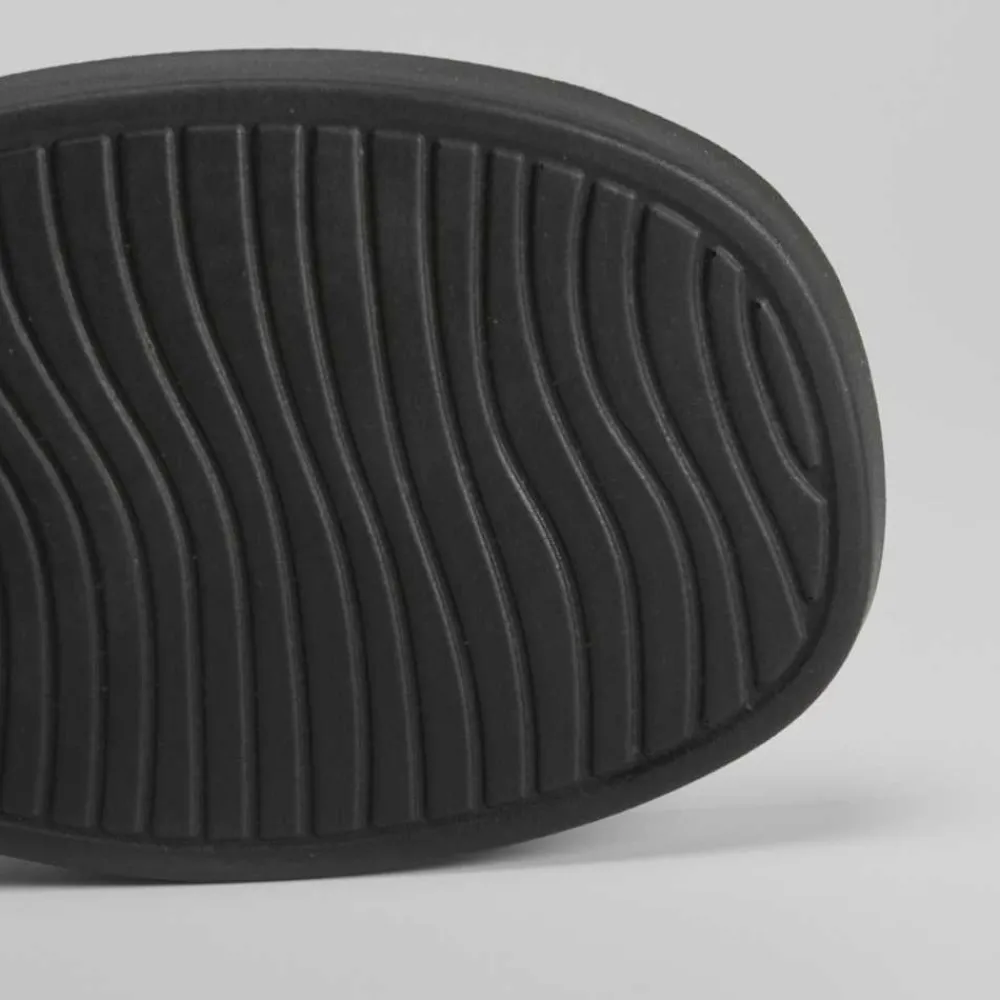 Sandalia negra con plataforma de la marca SENDA ROAD para mujer. Modelo monocolor con una tira diagonal en el empeine y cierre de hebilla.