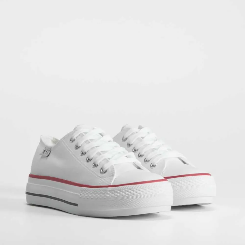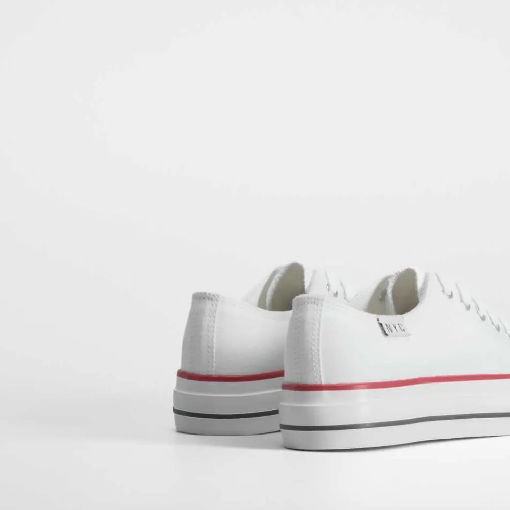 Sneaker básica en lona de la marca NYC. Modelo en color blanco con un cierre de cordones y un piso flatform de caucho con un cerco rojo.