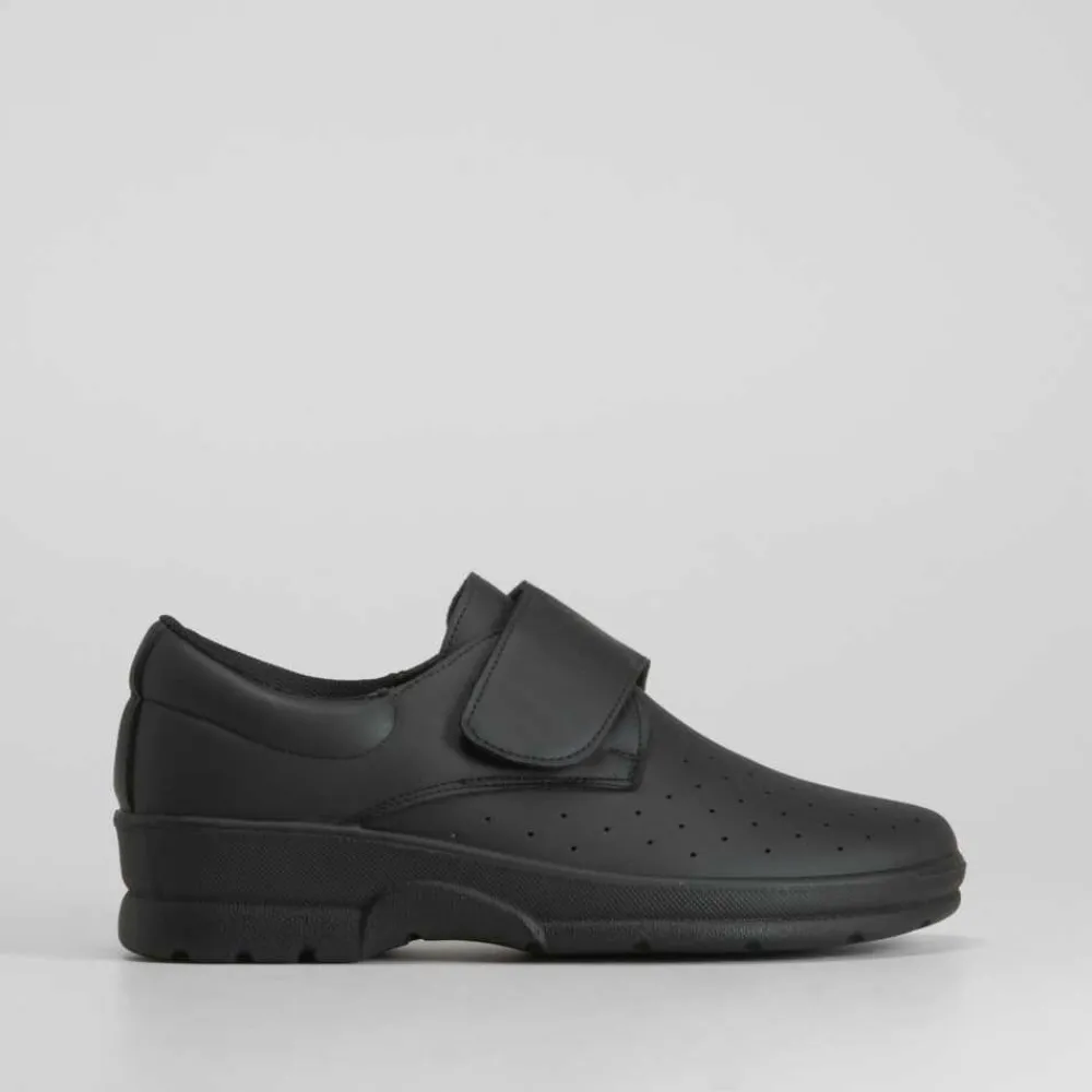 Zapato de trabajo cerrado para mujer en color negro de COMFEET SANICARE. Modelo con velcro y perforados en la pala. Plantilla extraíble.