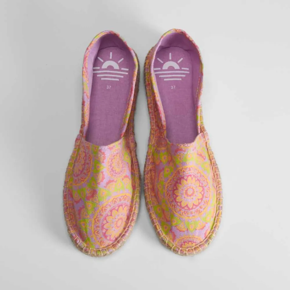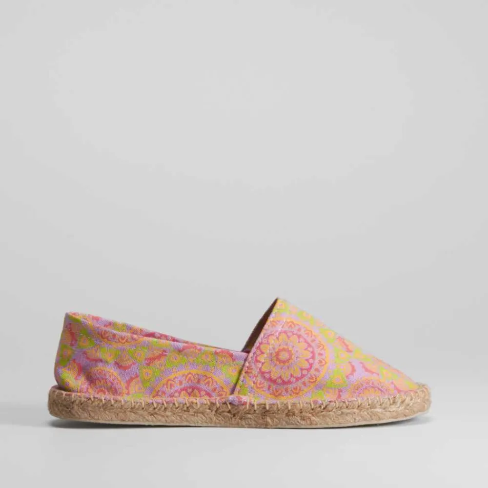 Alpargata básica de mujer con estampado étnico en tonos naranja y piso de esparto de la marca COCONUT DRIVE. Recomendamos coger una talla más de la que utilices habitualmente.